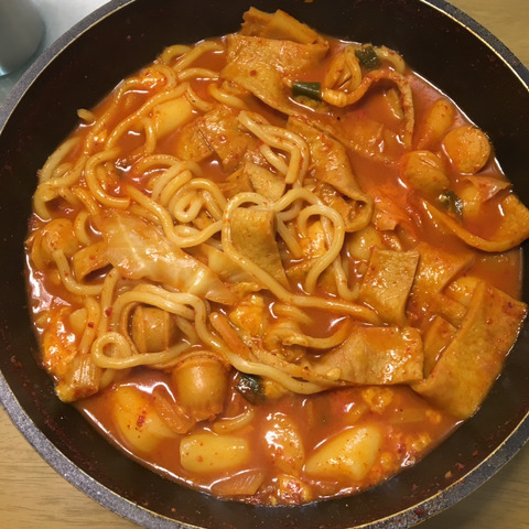 재료: 떡, 오뎅, 대파, 에드시런(양배추), 소시지, 피자치즈, 우동사리데스