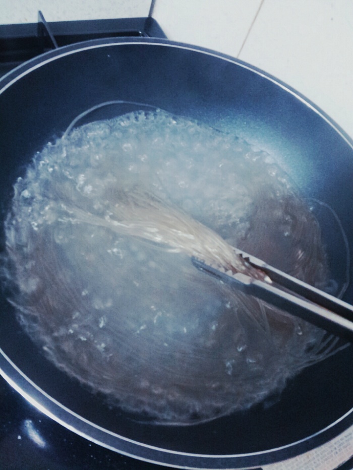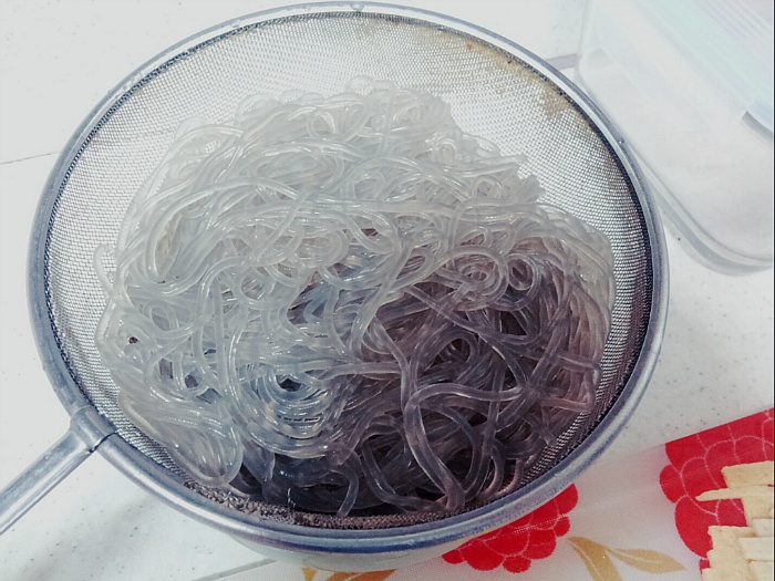 재료를 손질하는 동안 3~4분정도 익힌 당면을 건져서 찬물에 헹구어 주세요