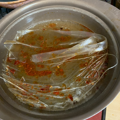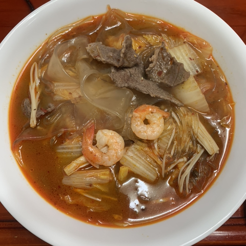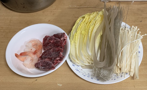 ‼️재료 : 마라탕 소스(또는 훠궈 소스), 소금, 다시다, 소고기(또는 양고기, 돼지고기), 새우, 당면 2종류, 배추, 팽이버섯 등 각종 야채
