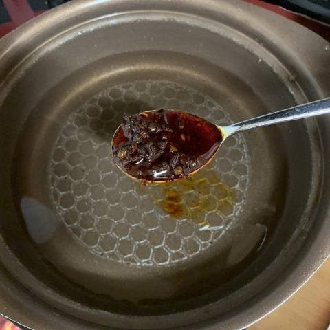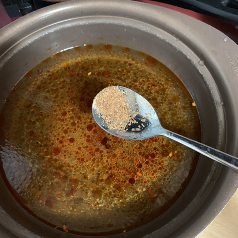 1. 냄비에 물 3컵에 사진과 같은 양만큼 소스 3숟가락을 넣으세요~ ((위에서도 말했듯 이 소스는 상급자용 얼얼한 맛이 강한 소스이기 때문에 마라탕이 처음인 분들 또는 초보자는 2숟가락만 넣고 나중에 추가해 주세요~~ 나중에 더 넣어도 됨))