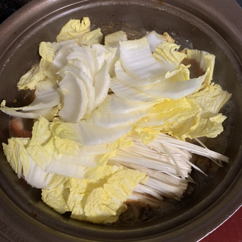 6. 배추 줄기부분이 다 익을 때까지 (글쓴이 기준 너덜해질 때까지) 끓여주고 간을 봅니다~ 얼얼한 맛이 부족하면 소스를 추가하고 싱겁다 하면 소금을 추가합니다~ (나는 소스 2숟가락 더 넣음 총 5숟가락)