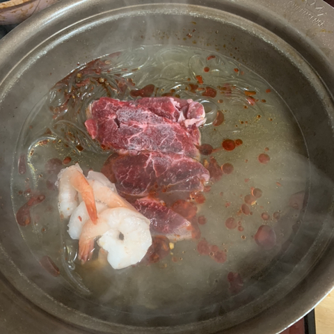 4. 소고기와 새우 등 언 재료들을 넣어줍니다~ ((나는 마라탕을 거의 매일 먹어서 사태살 덩어리로 사서 얇게 썰어서 1인분 양만큼씩 얼려놓음 다른 분들은 그냥 샤브샤브 고기 주세요 해서 사거나 아무 고기나 넣으면 됨 글쓴이는 고기 없을 때는 삼겹살 에어프라이어에 구워서 넣어 먹어도 봤는데 이건 좀 별로였음,,, 얇은 고기로 하시오))