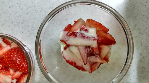 손질한 딸기를 넣고 또 연유를 촵촵 뿌리고