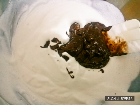 거품을 올린생크림에 초콜릿+생크림을 넣고 섞어줘