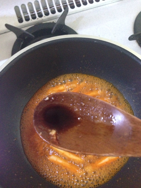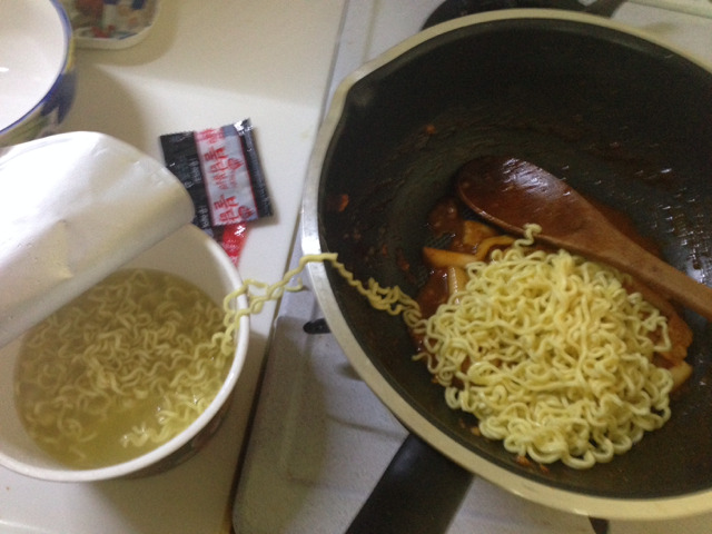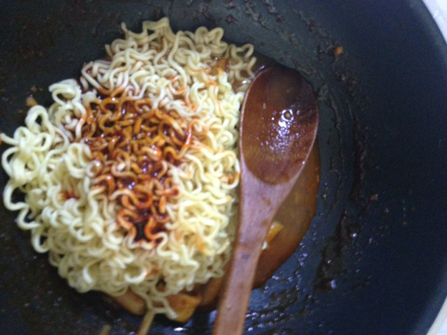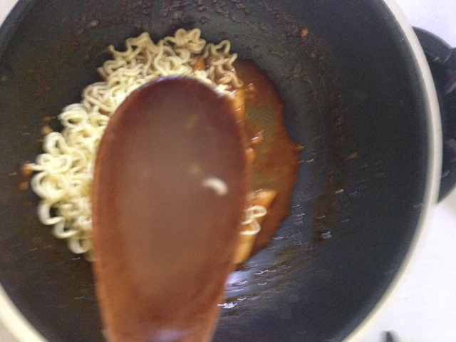 8. 불닭소스 투척! 이 때 너무 졸지 않도록 컵 불닭 안의 물을 넣어준다. (나는 저걸로 떠서 2-3번정도 넣었어)