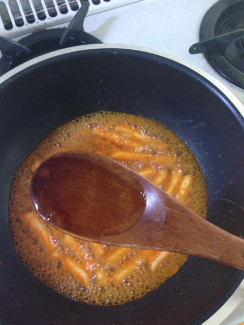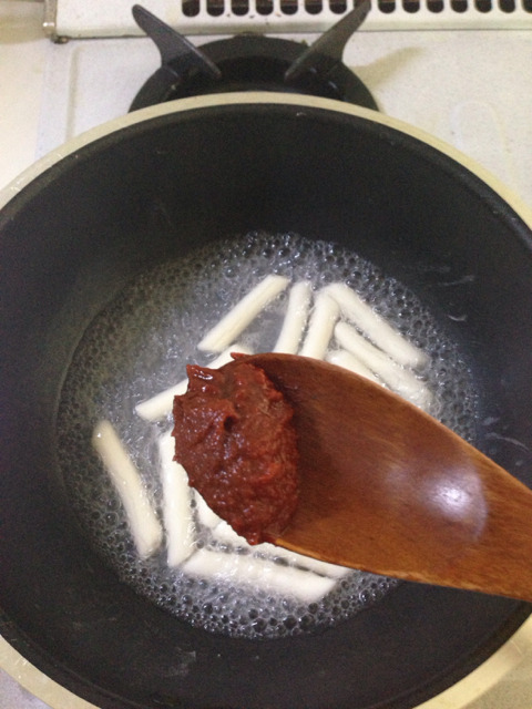 2. 떡이 말랑해지면 떡이 간신히 잠길정도만 물을 남기고 고추장을 사진만큼 넣는다