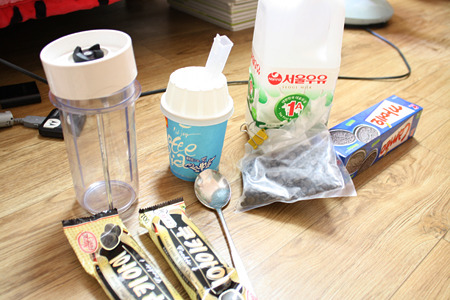 믹서기 토네이도담을통 우유 쿠키아이(쿠앤크가없었...) 숫가락 초코칩(없어도됨) 까메오