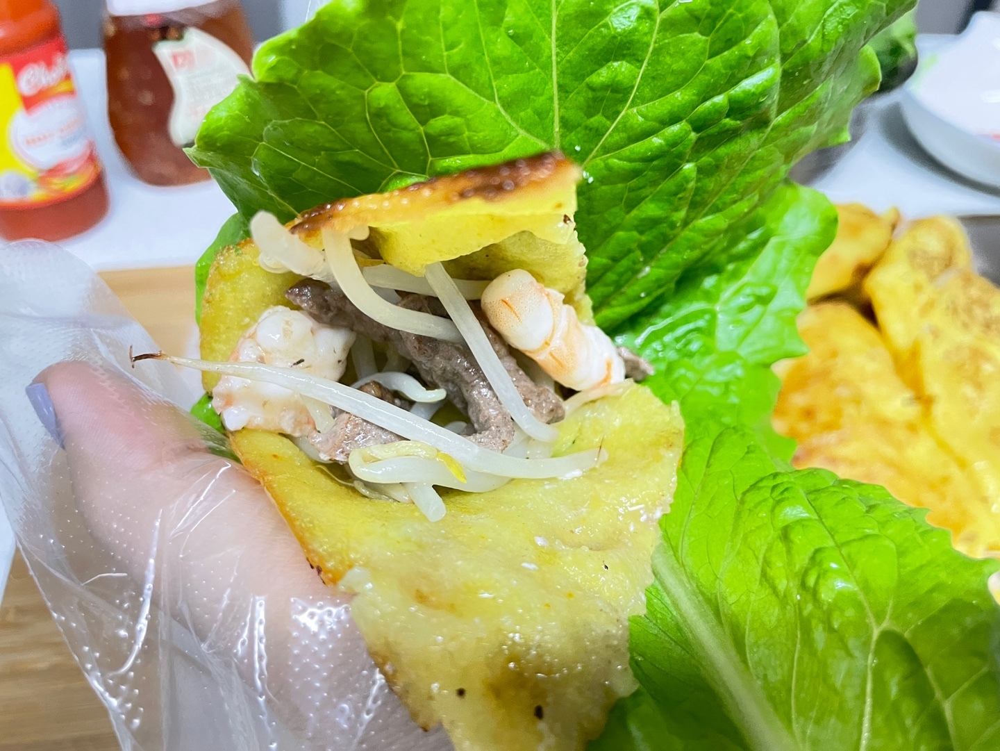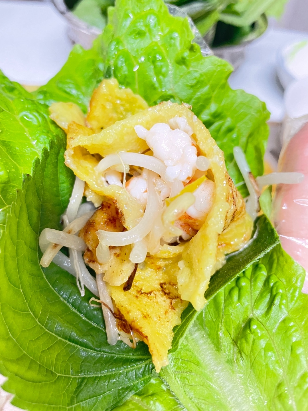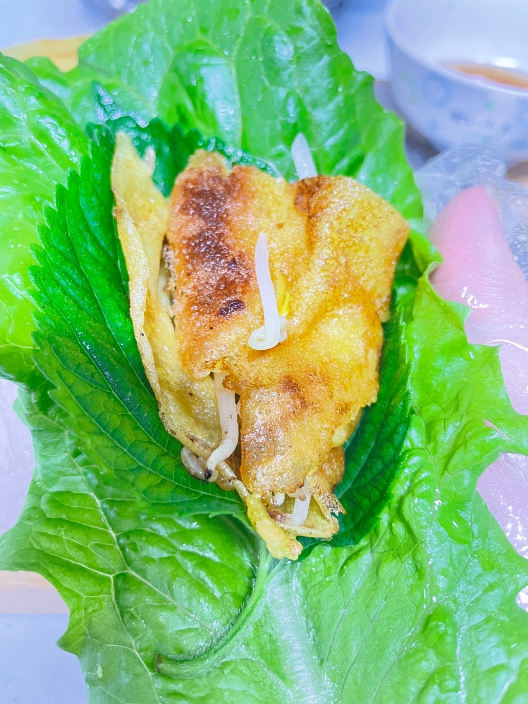 바삭한 반죽+ 아삭한 숙주+ 새우의 톡톡터짐+ 소고기의 육즙 + 상추의 개운함 + 느억맘소스의 달콤+시큼한 맛