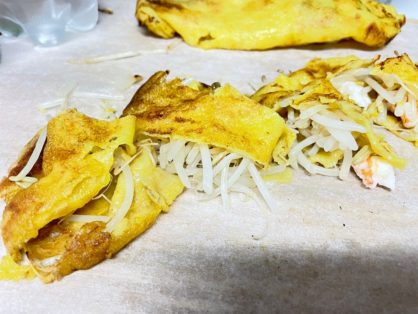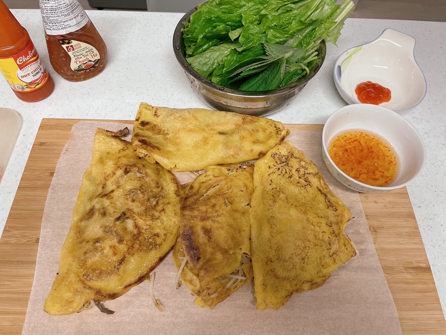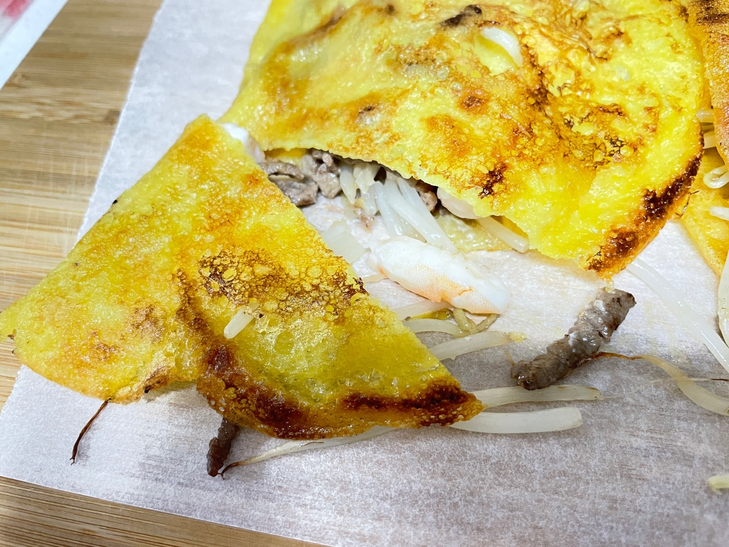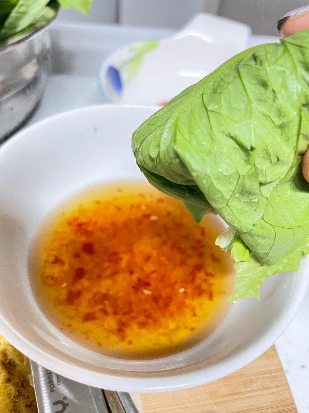 바삭한 반죽+ 아삭한 숙주+ 새우의 톡톡터짐+ 소고기의 육즙 + 상추의 개운함 + 느억맘소스의 달콤+시큼한 맛
