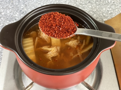 ①익은 김치 ②김칫국물 ③일반 참치 작은 거 ④고추 참치 작은 거 ⑤고춧가루