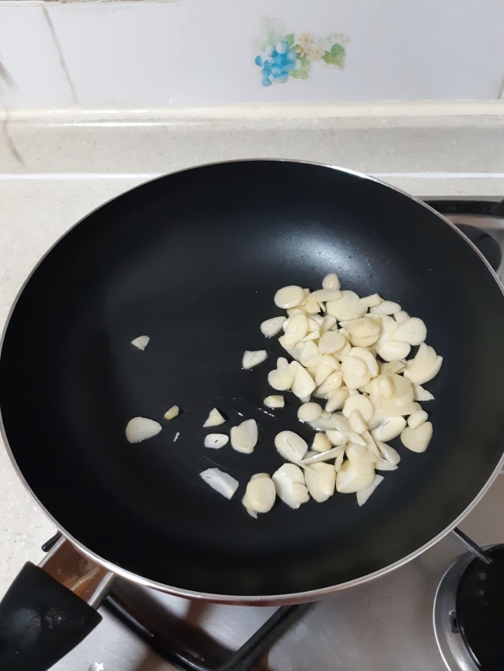 통마늘 썰어서 기름약간 뿌려서 볶고있기