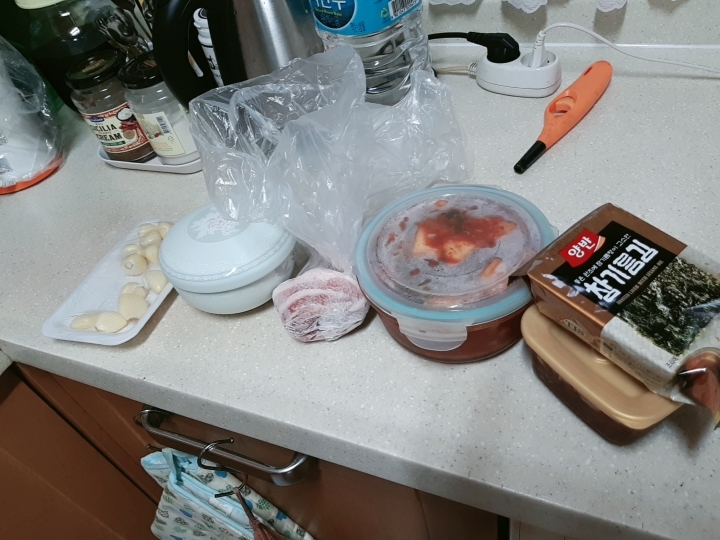 통마늘, 밥, 삼겹살, 김치, 고추장, 김 +간장, 김