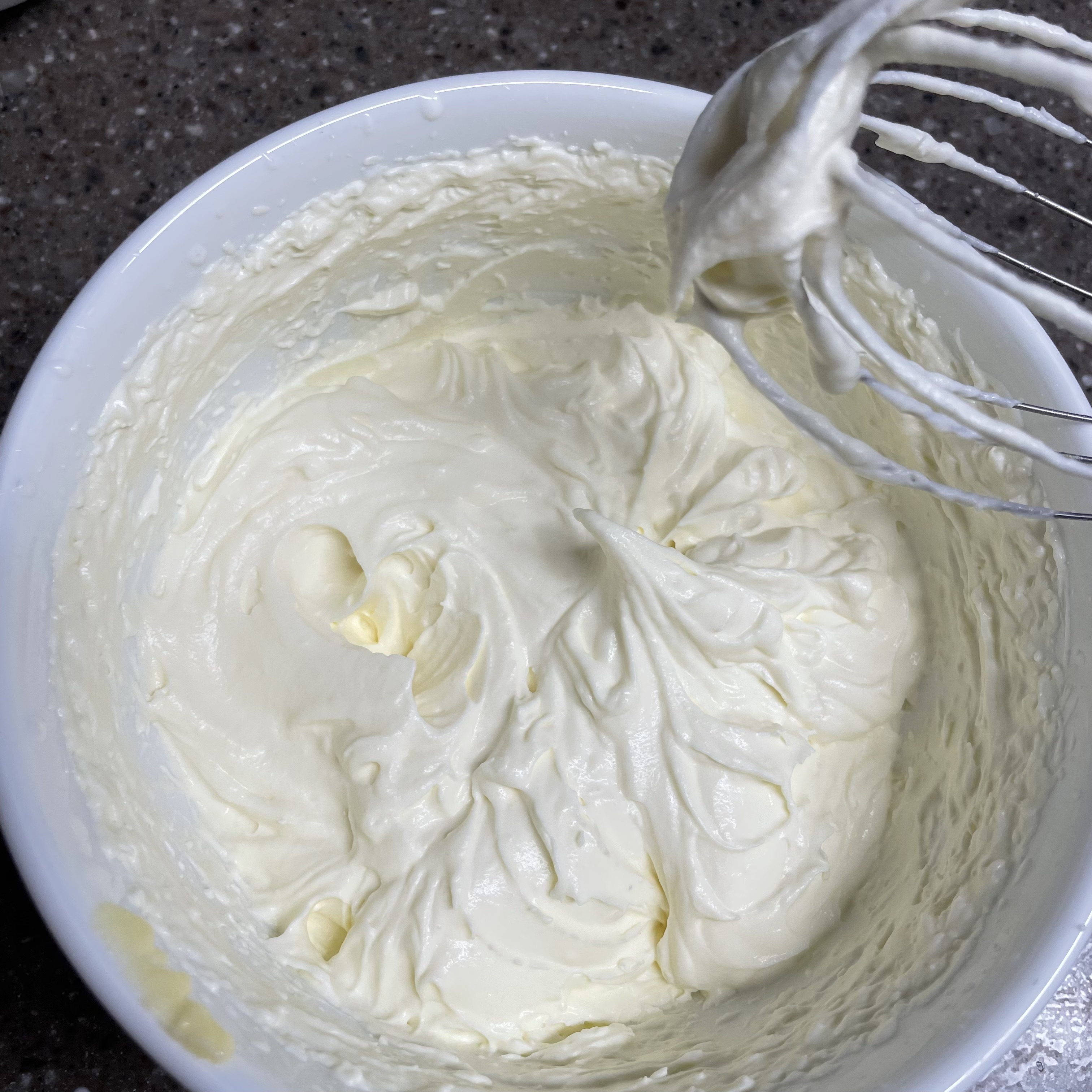 커스터드 크림이 식어서 굳었다면 생크림 150ml에 설탕 50g을 넣고 휘핑 쳐줍니다
