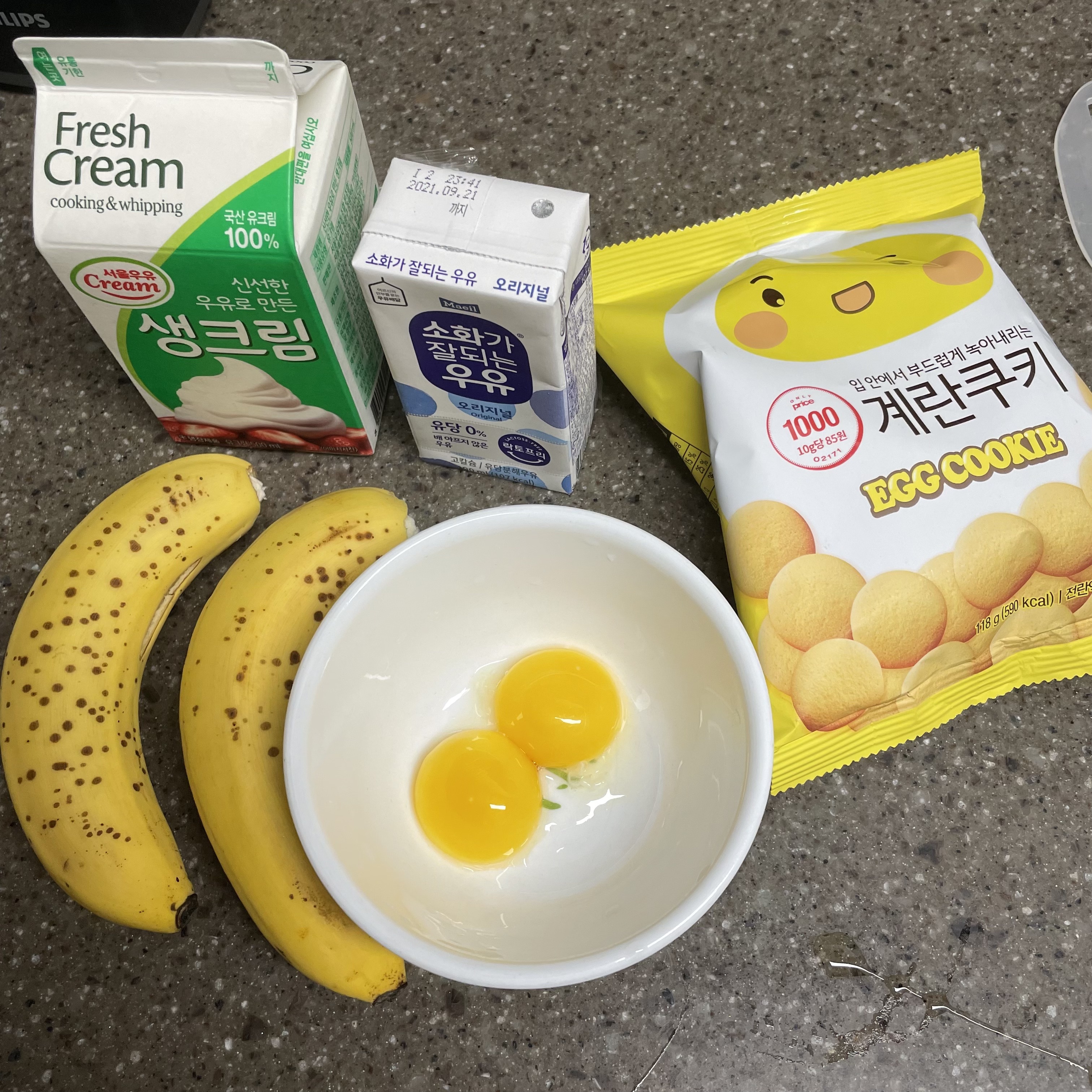 계란 노른자 2개, 바나나, 우유, 생크림, 계란과자, 설탕, 밀가루(옥수수전분 대체가능)