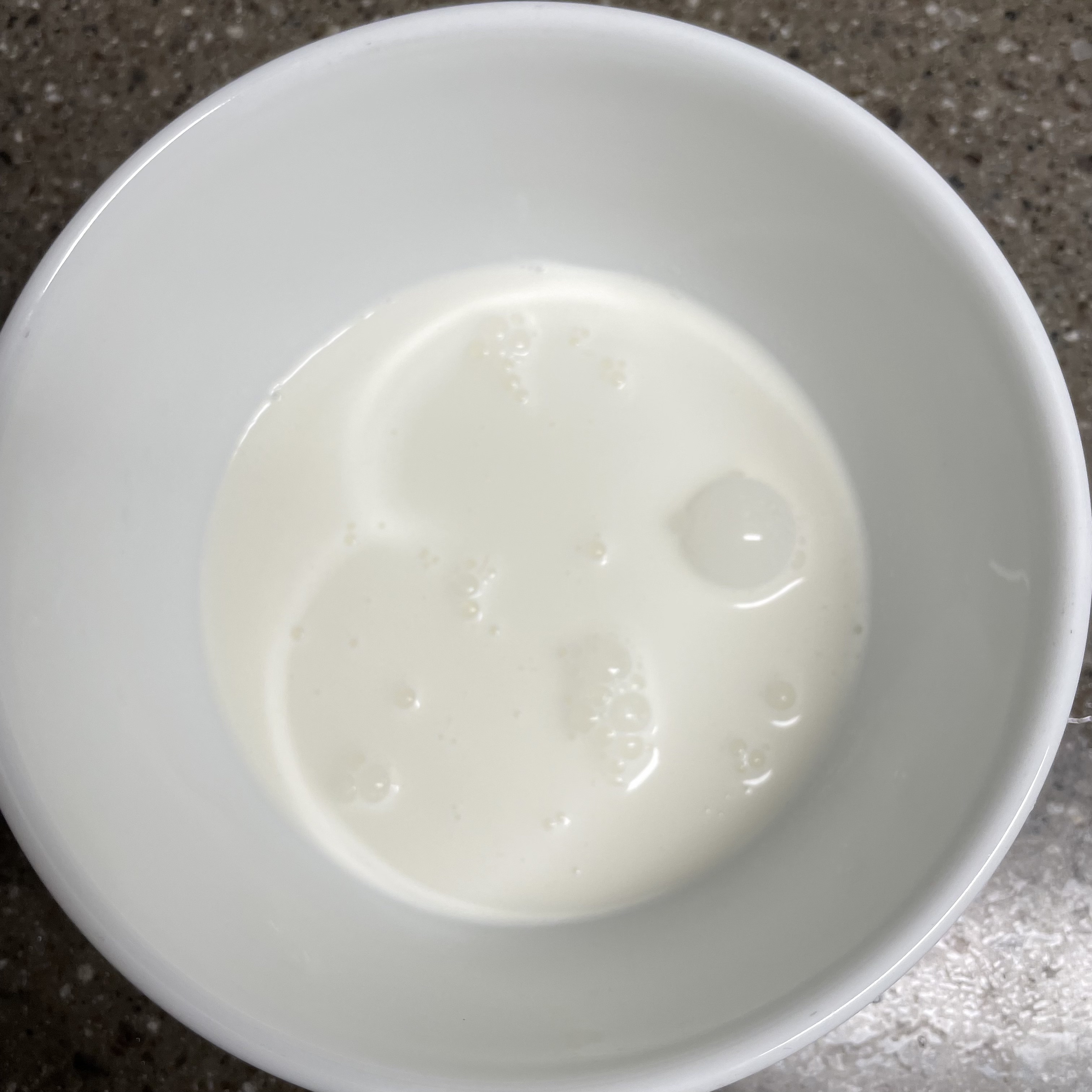 계란 노른자 2개에 우유 150ml, 설탕 50g, 밀가루 20g 넣고 잘 섞어줍니다