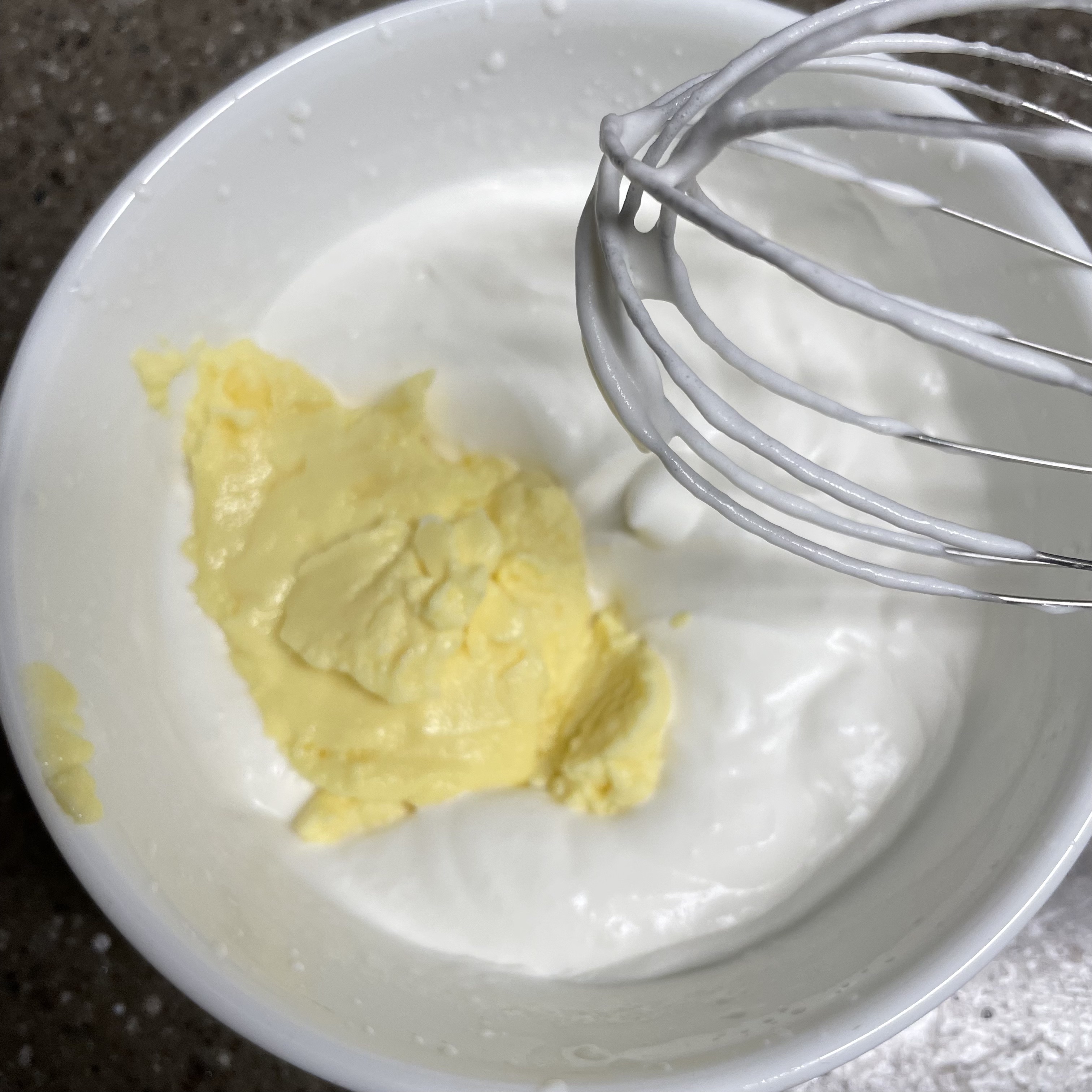 휘핑이 반정도 쳐졌을때 커스터드 크림을 넣고 같이 섞어줍니다
