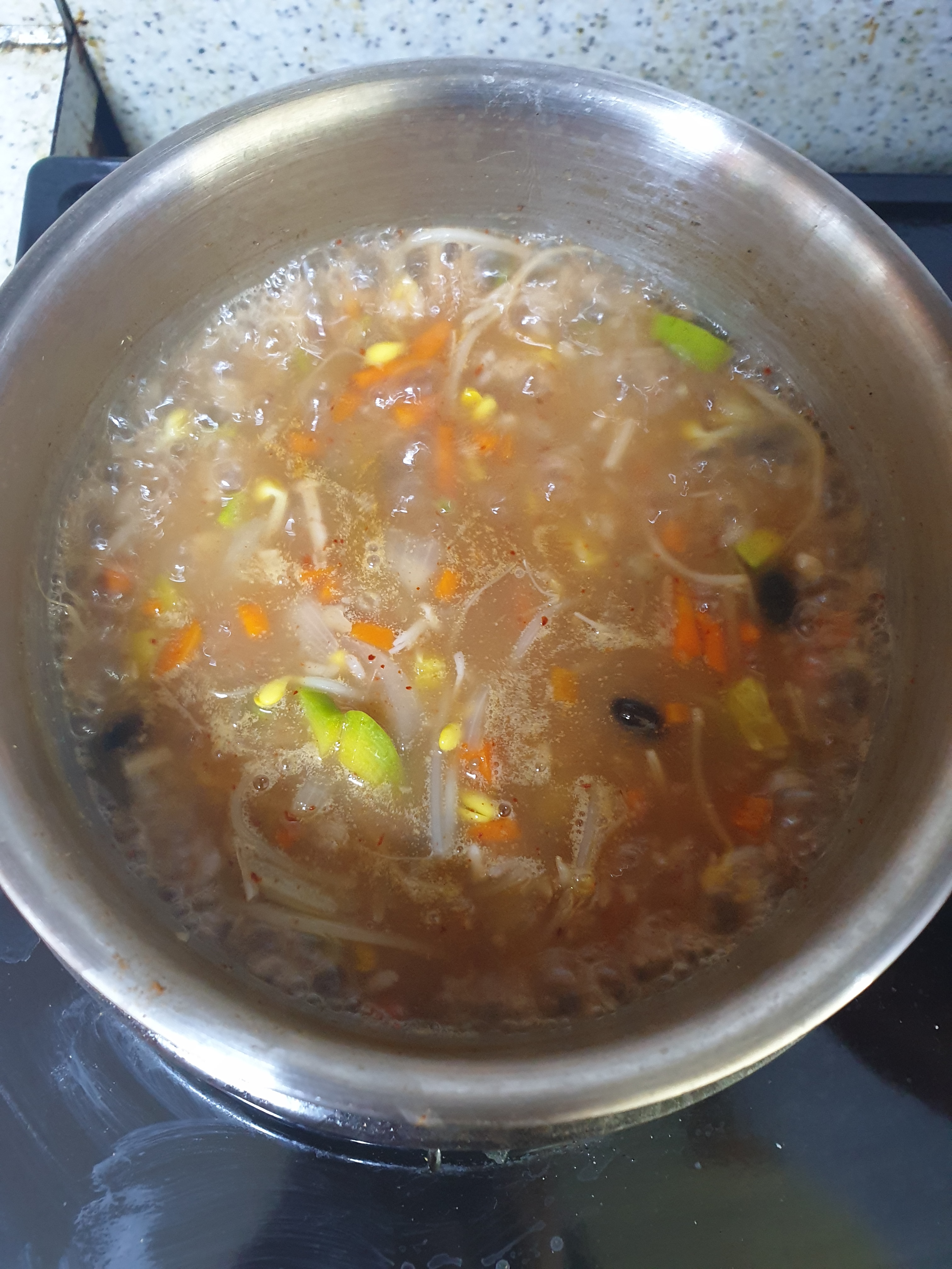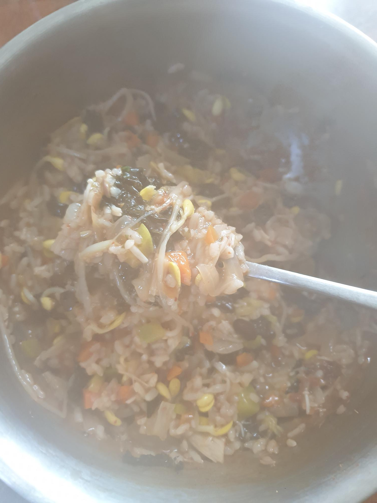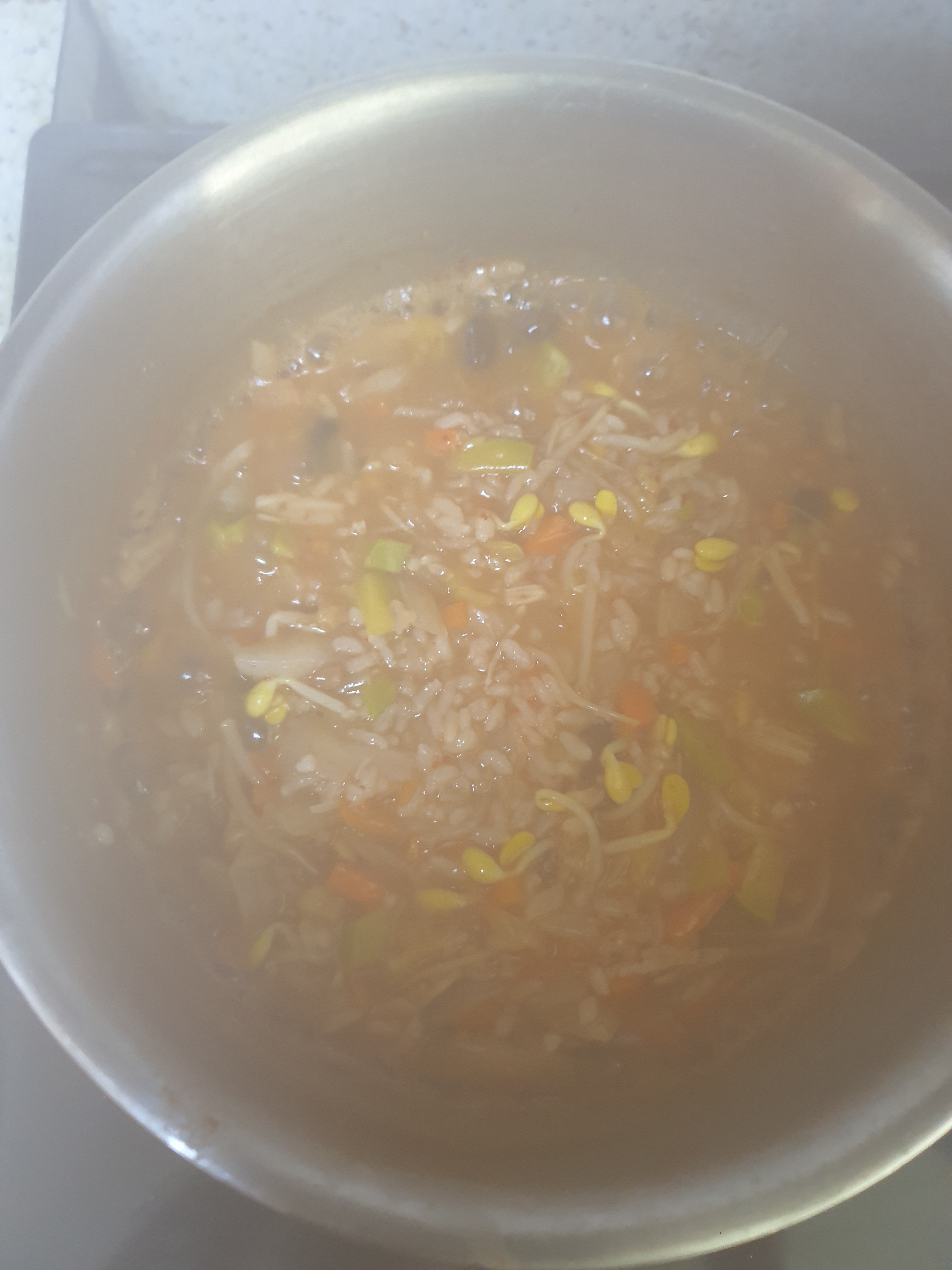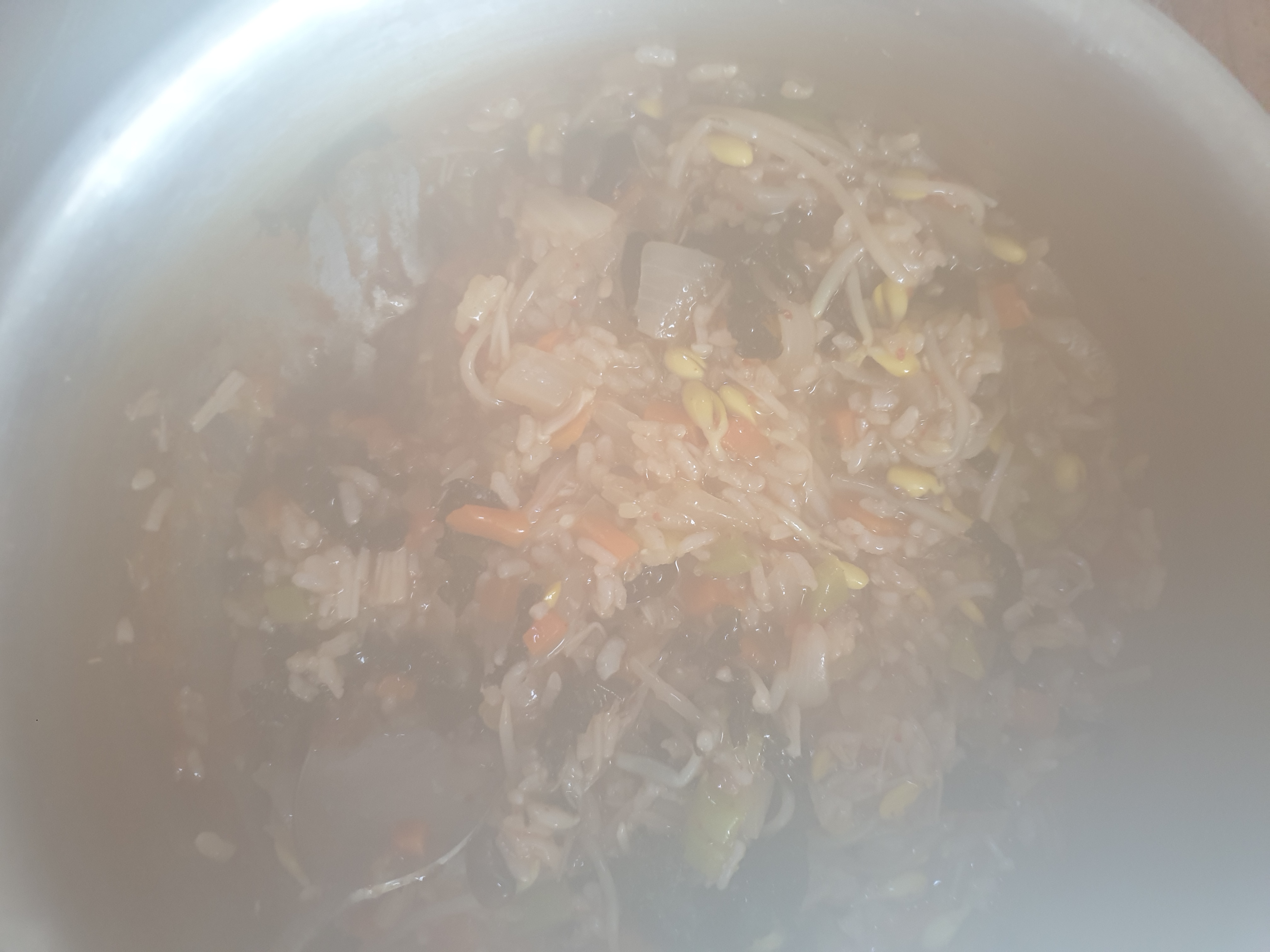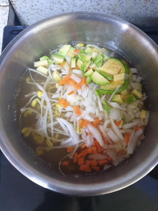 죽용 - 된장, 콩나물 한줌, 애호박 1/10, 양파, 당근, 팽이버섯, 밥, 다시다(선택), 미원(선택), 챔기름, 계란(선택)