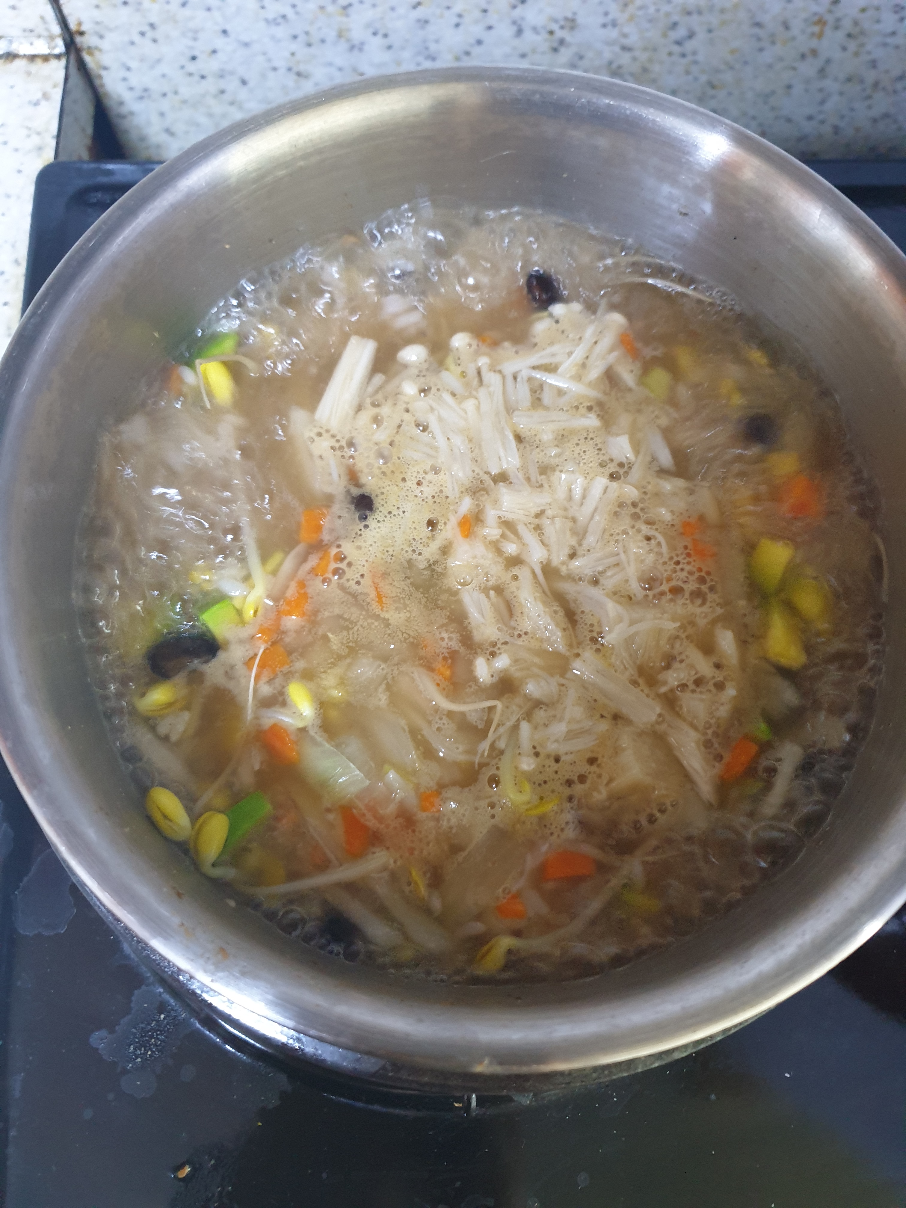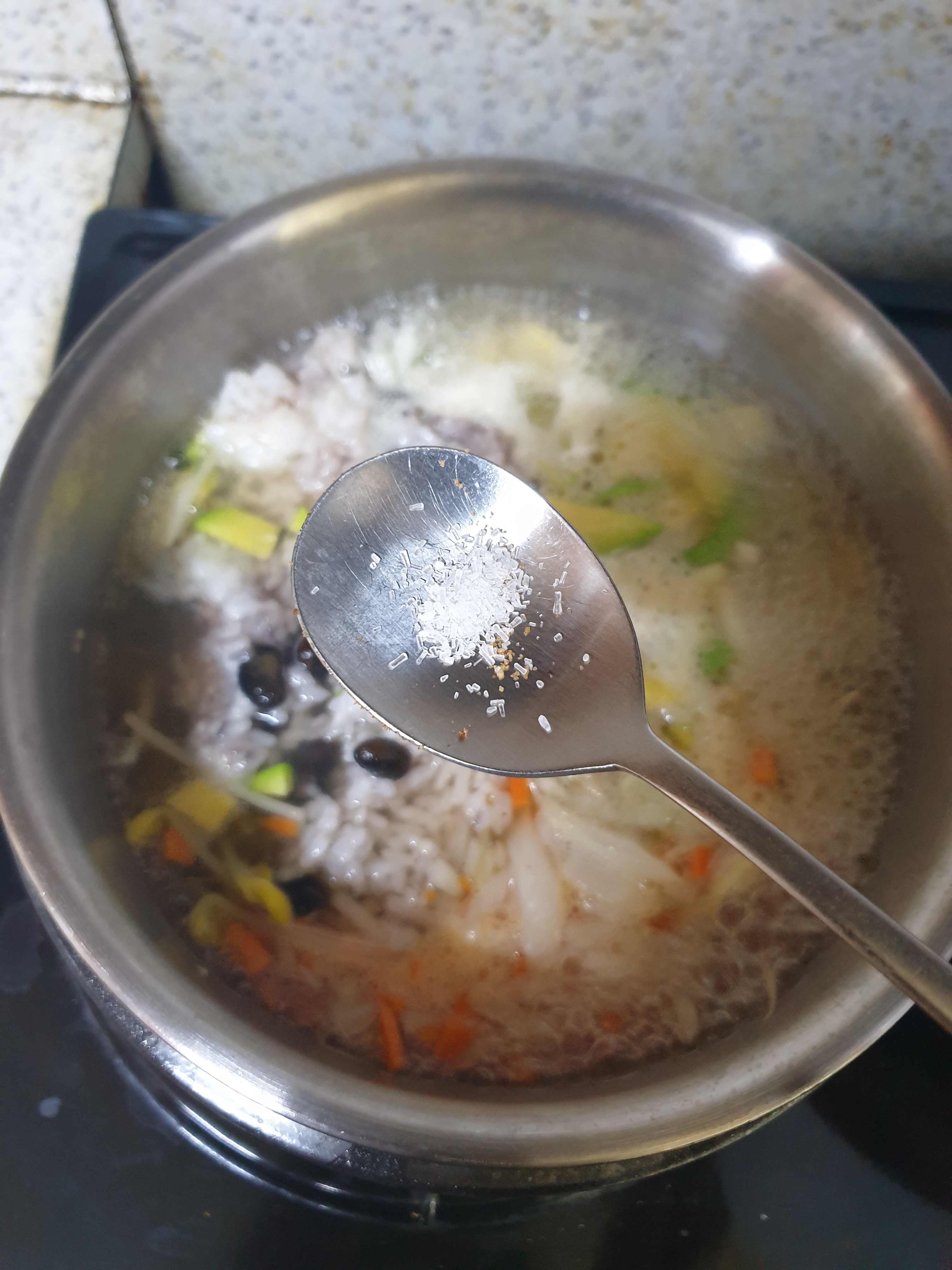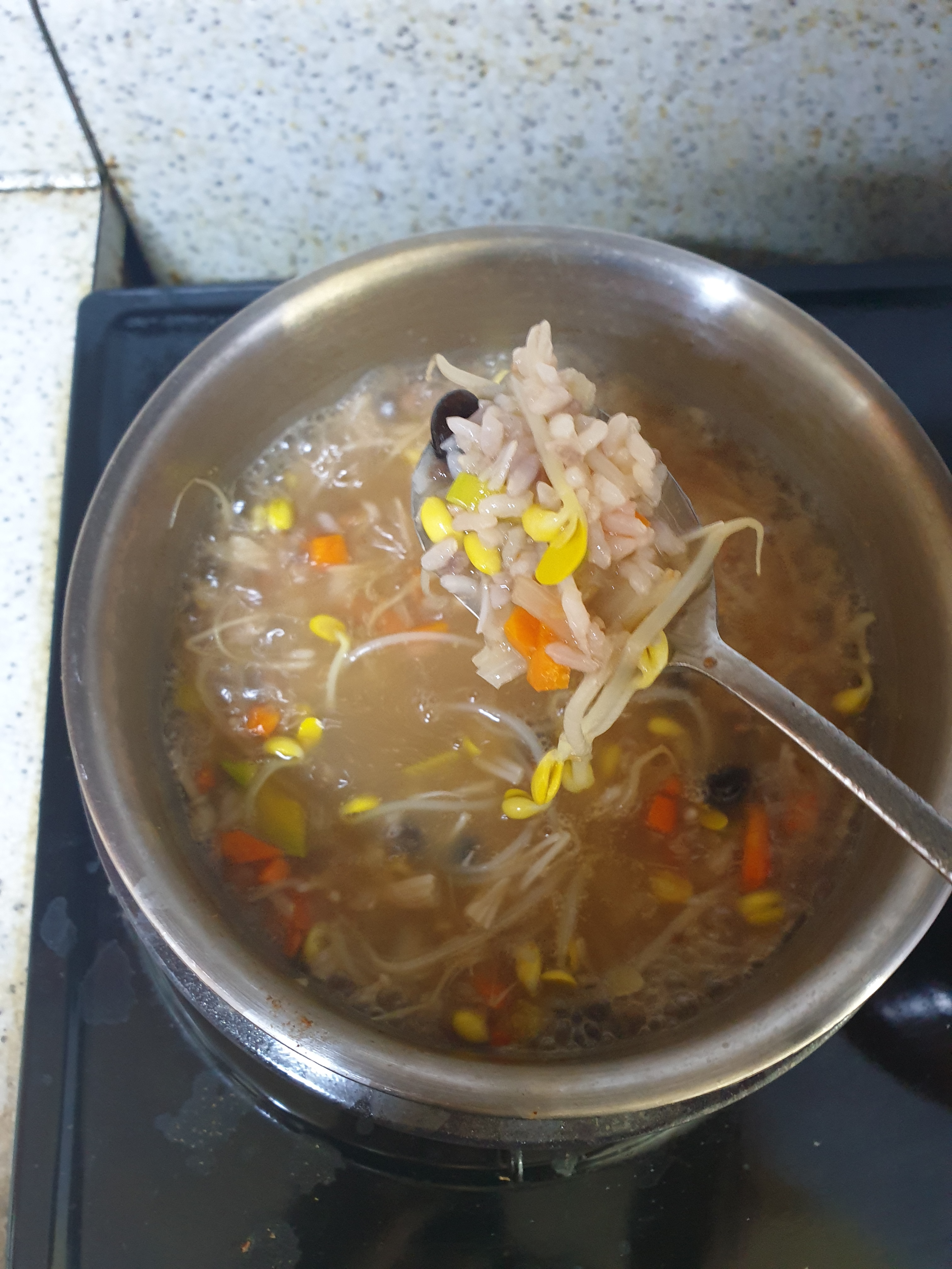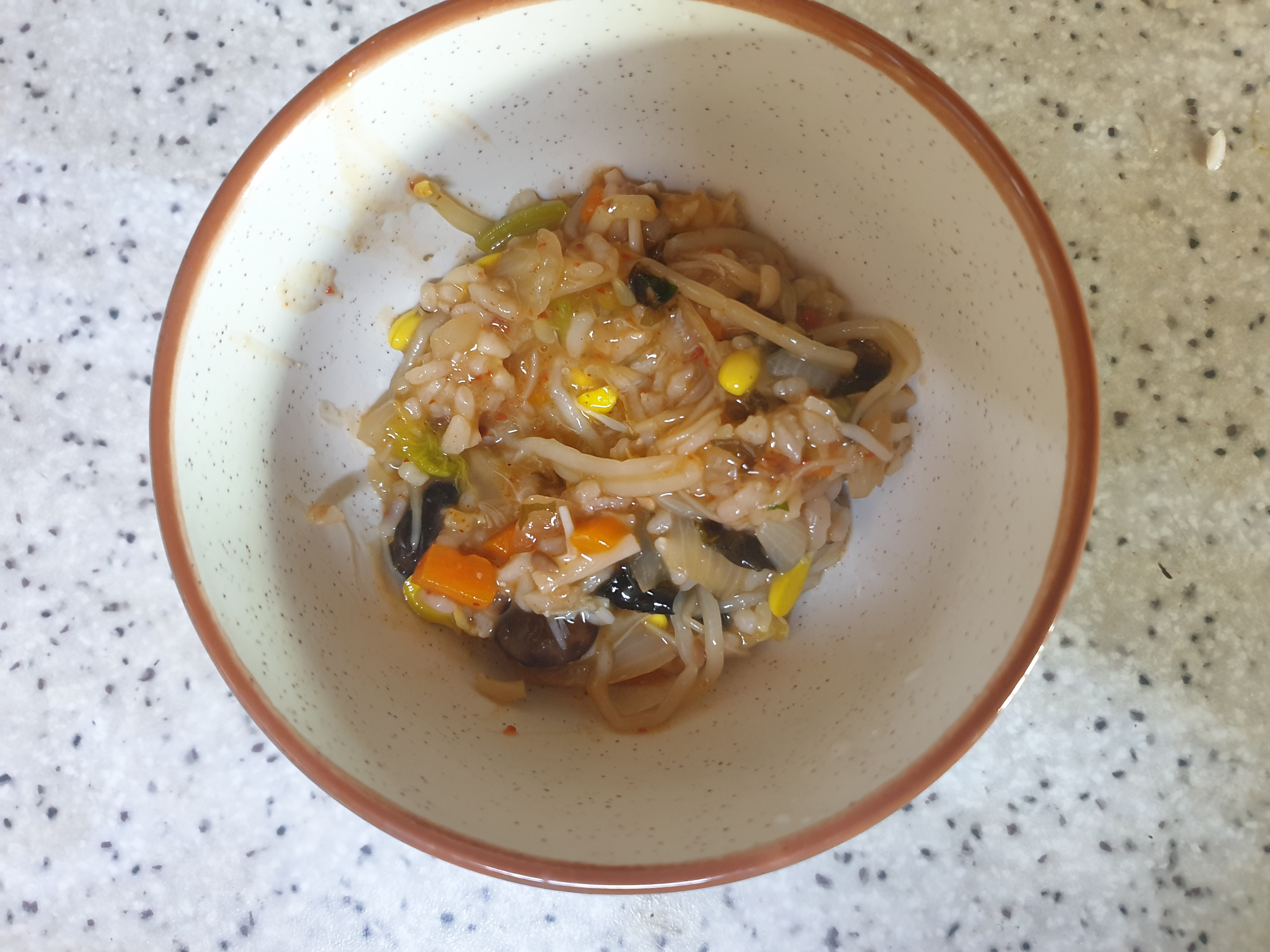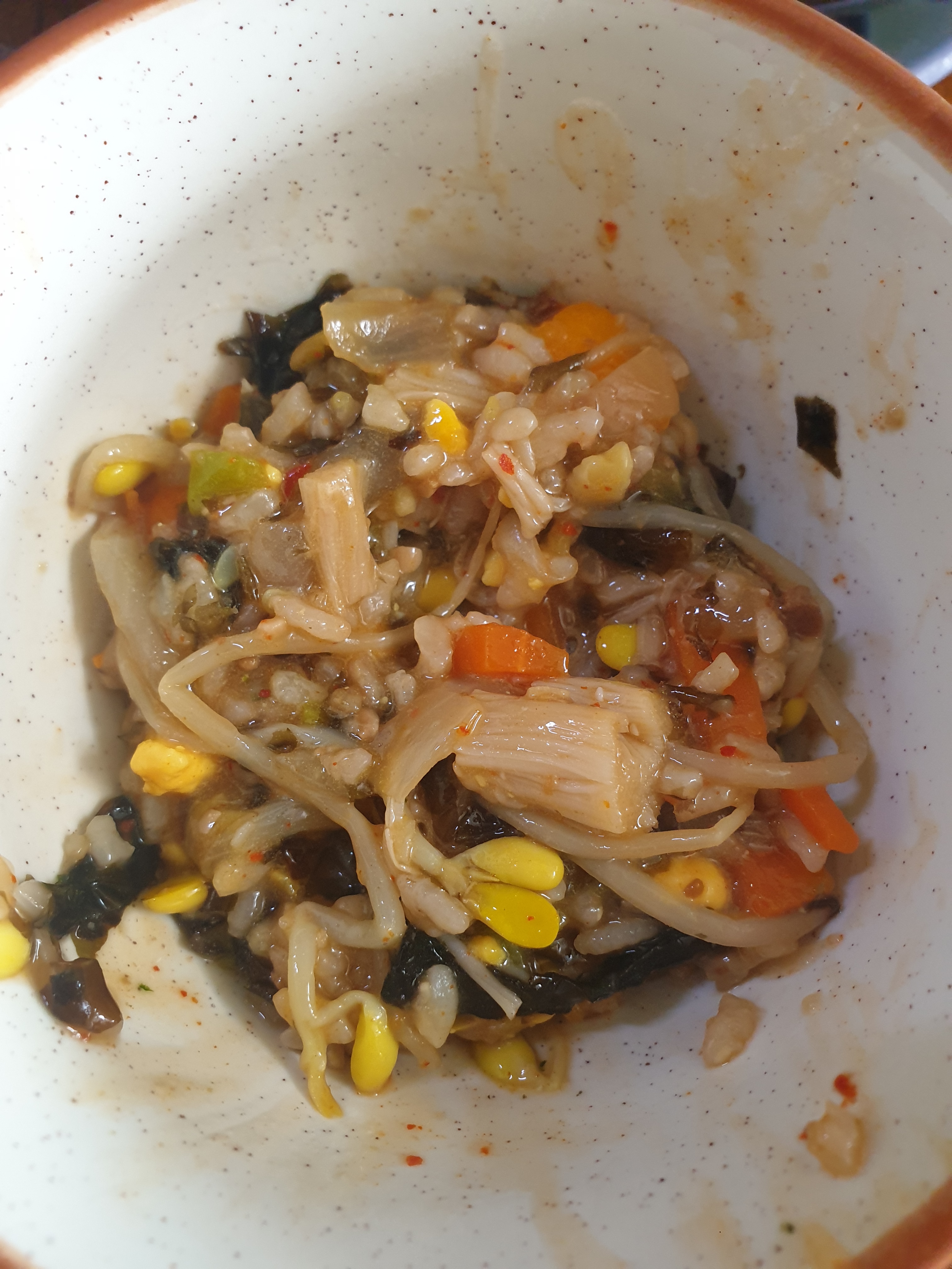 죽용 - 된장, 콩나물 한줌, 애호박 1/10, 양파, 당근, 팽이버섯, 밥, 다시다(선택), 미원(선택), 챔기름, 계란(선택)