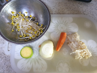 그동안에 된장죽에 넣을 야채 준비 ! 나는 콩나물, 호박, 양파, 당근, 팽이버섯(얼려놓은거임...)