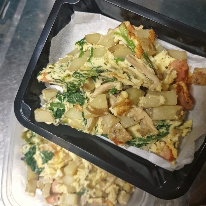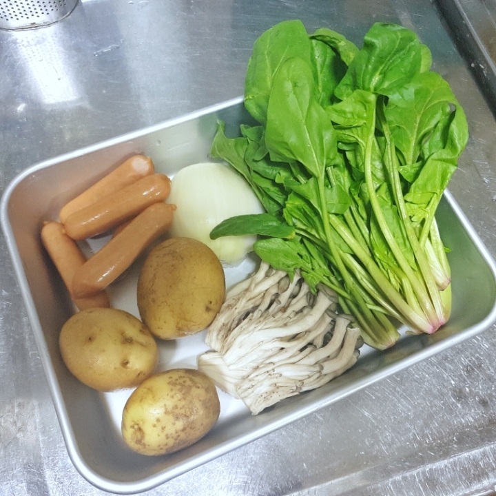 재료: 감자 작은알 3개, 시금치 6뿌리(??), 버섯, 햄, 양파