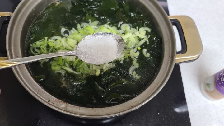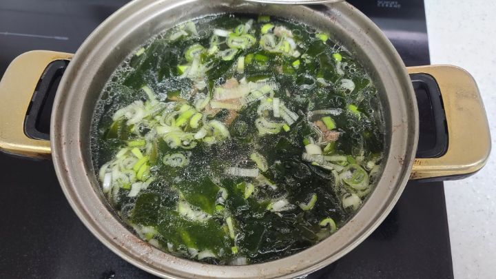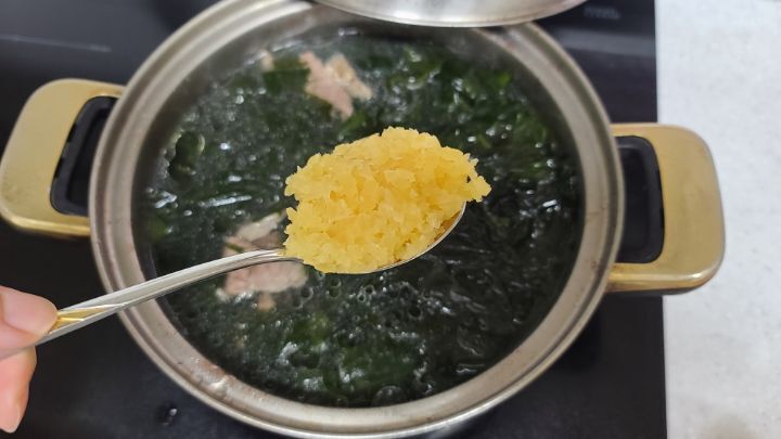 13. 미역색이 노란빛돌때까지 한소끔 끓이기