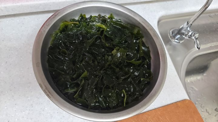 4.미역(자른미역, 그냥 건조된미역은 칼이나 가위로잘라줘)을 물에담가서 불려줘(5분~10분)