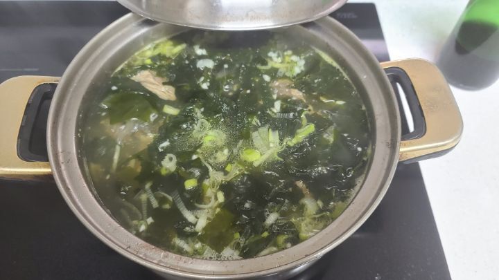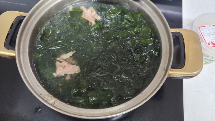 6.미역불린것 건져서 넣고 고기자른것 같이 육수에넣기