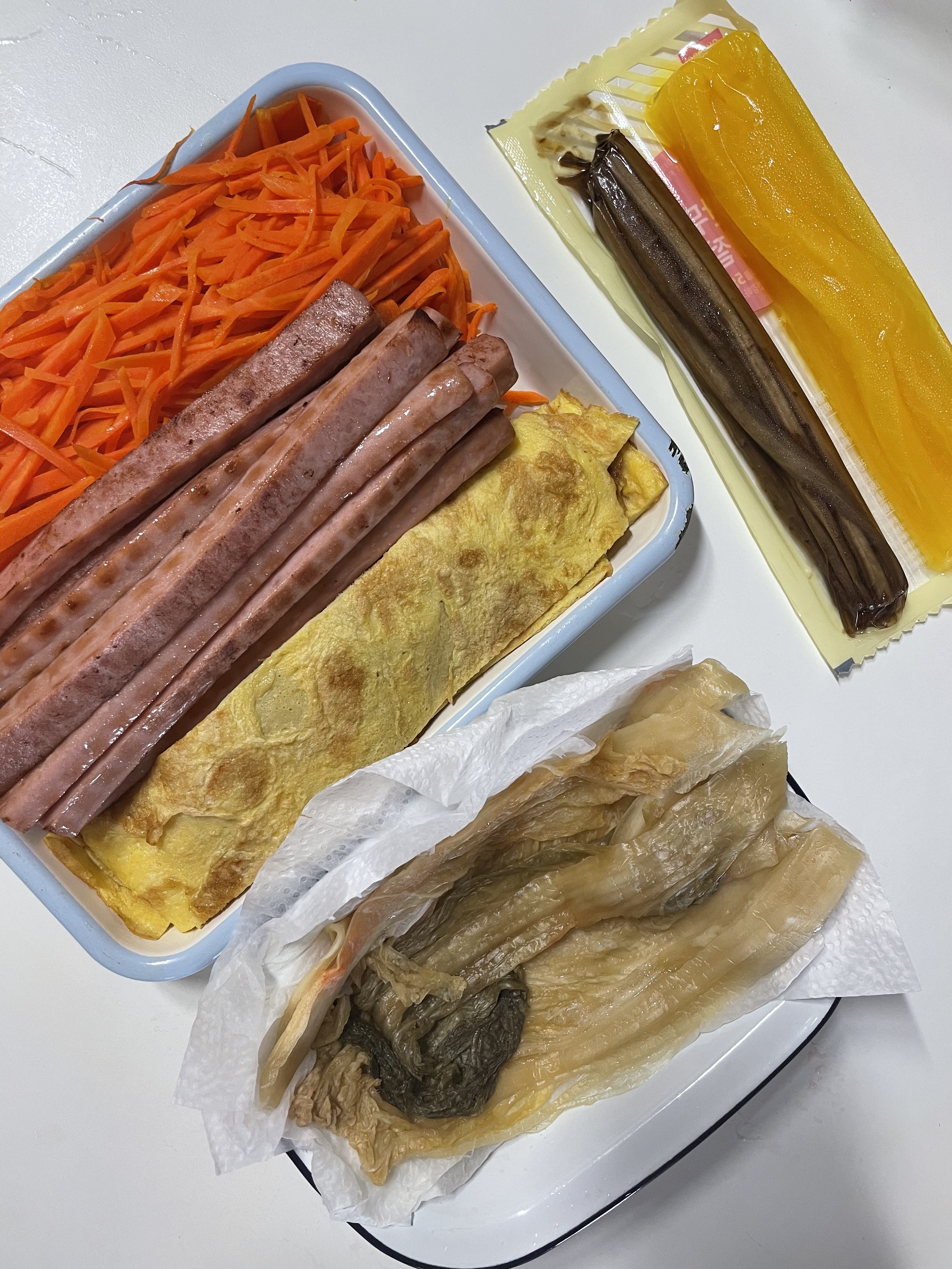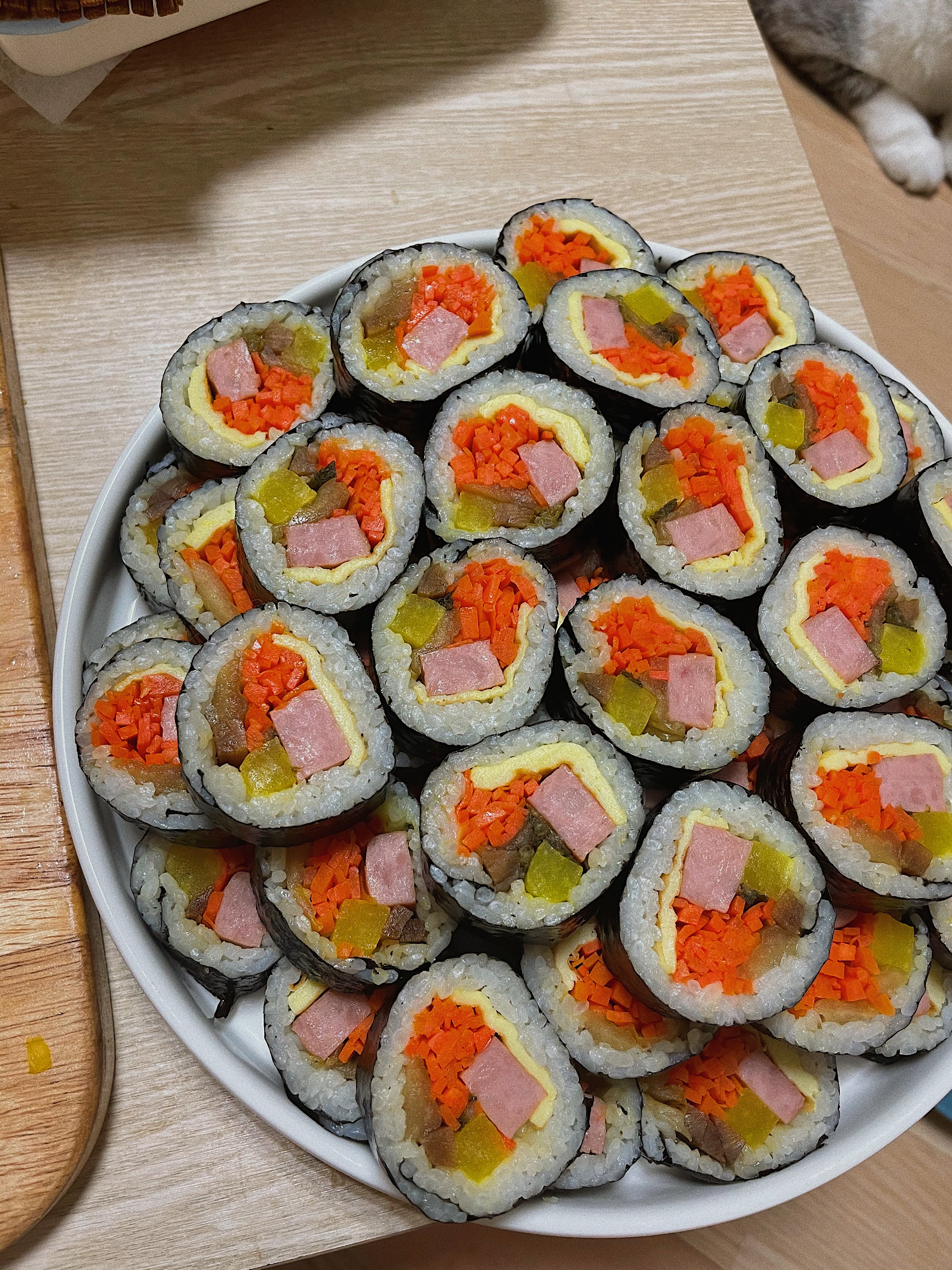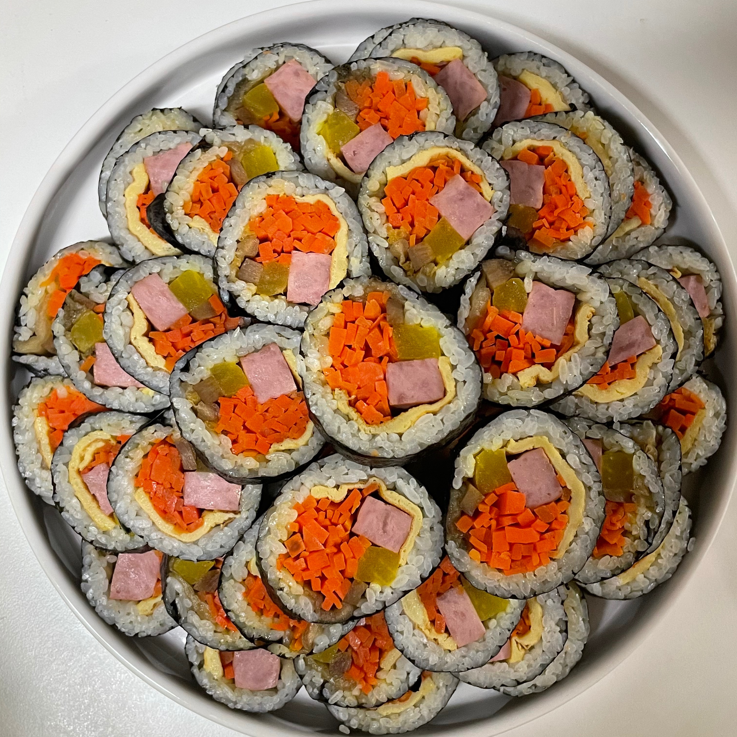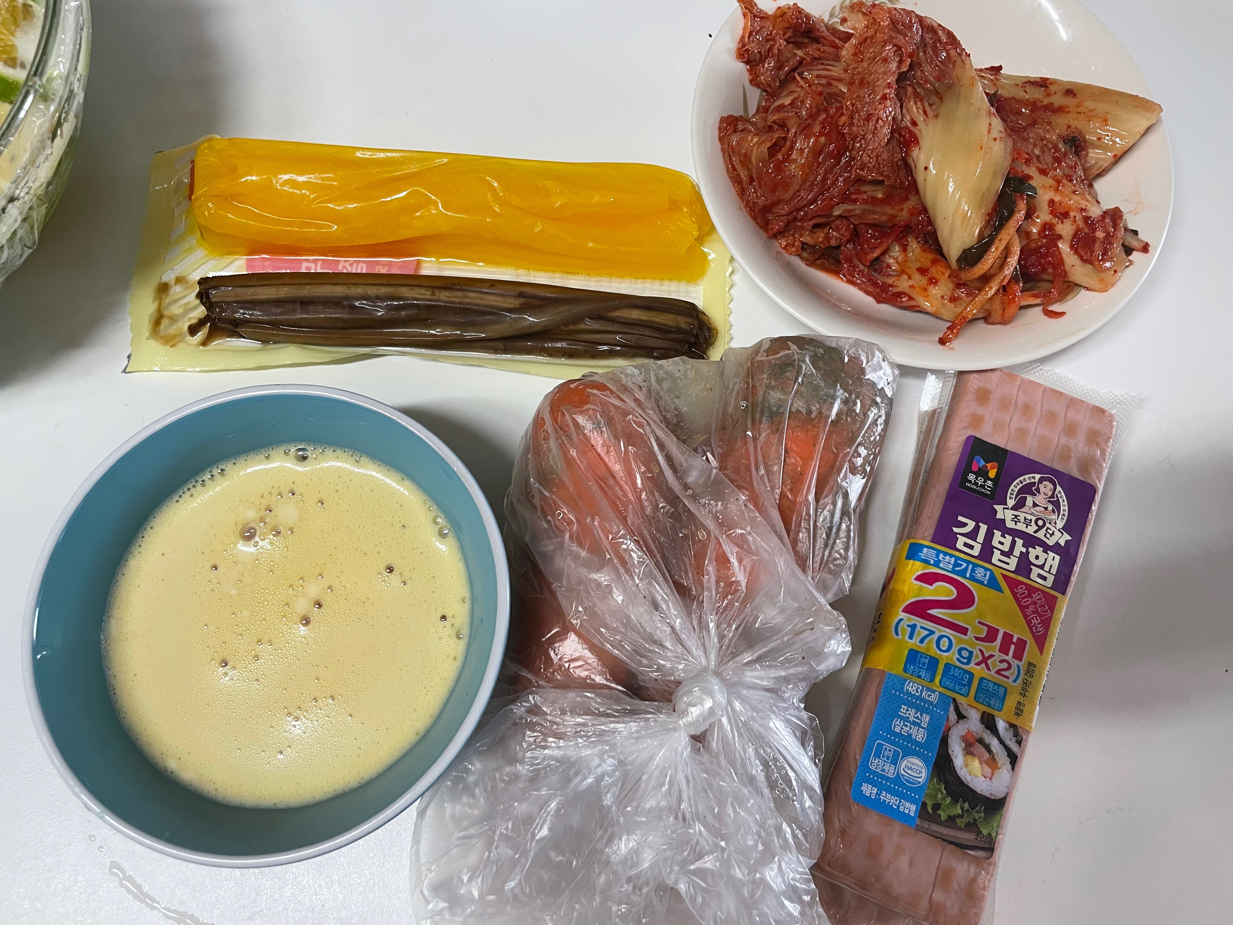 속재료 : 당근 2개, 단무지, 우엉, 달걀 5개, 김밥 햄, 배추김치