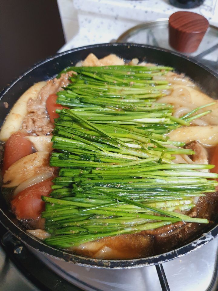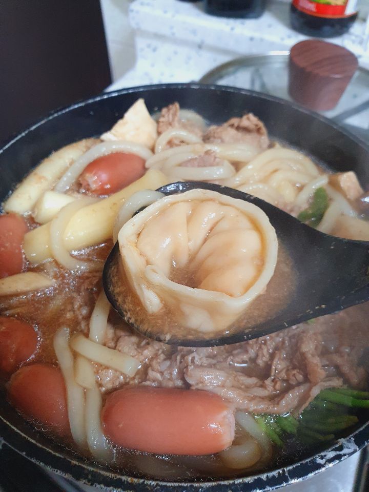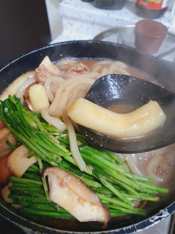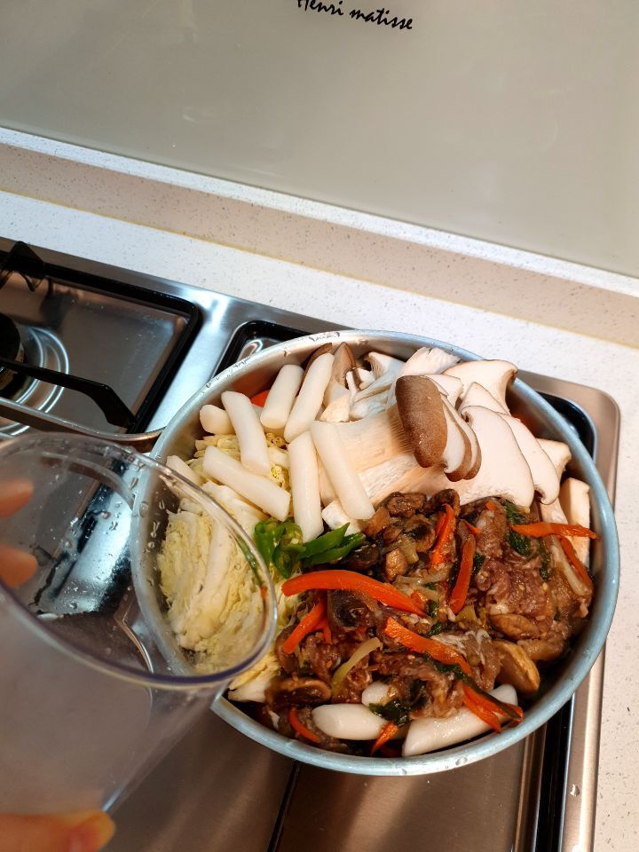 채소취향껏, 소고기(불고깃감이나 샤브용), 버섯, 감자, 떡이나 우동사리, 소시지 두부 유부 등 맘대롱!