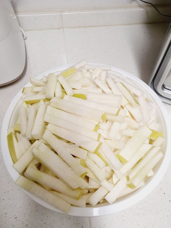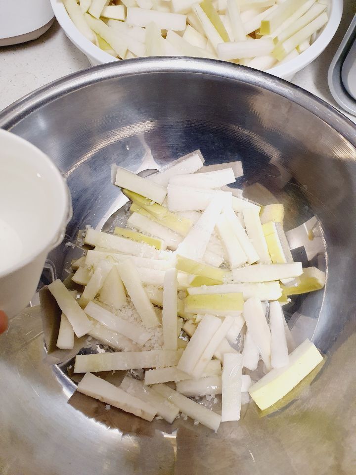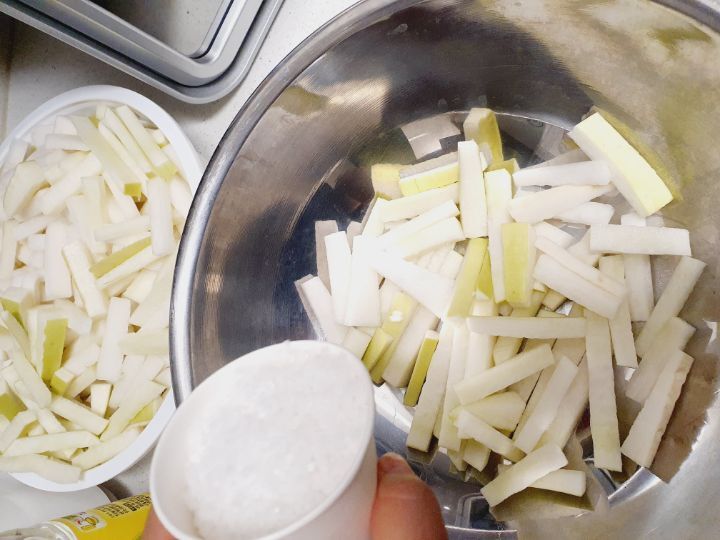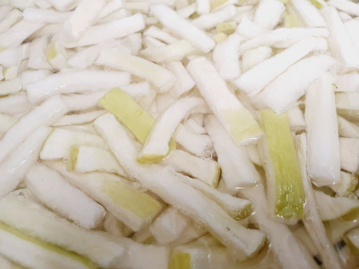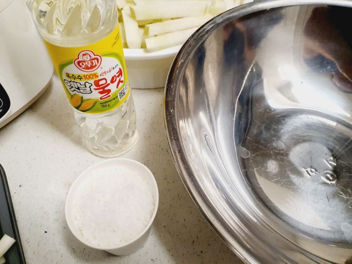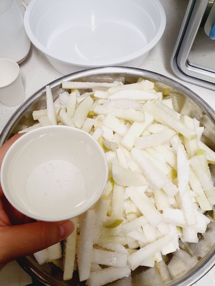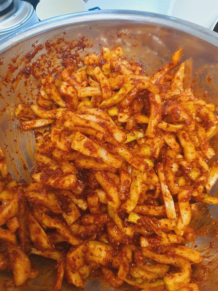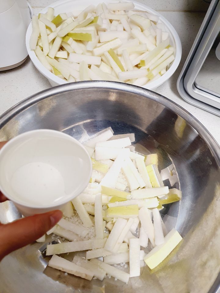 소금이랑 물엿이랑 무가 삼투압 현상으로 무를 더 맛있고 꼬들꼬들하게 만들어줍니다.