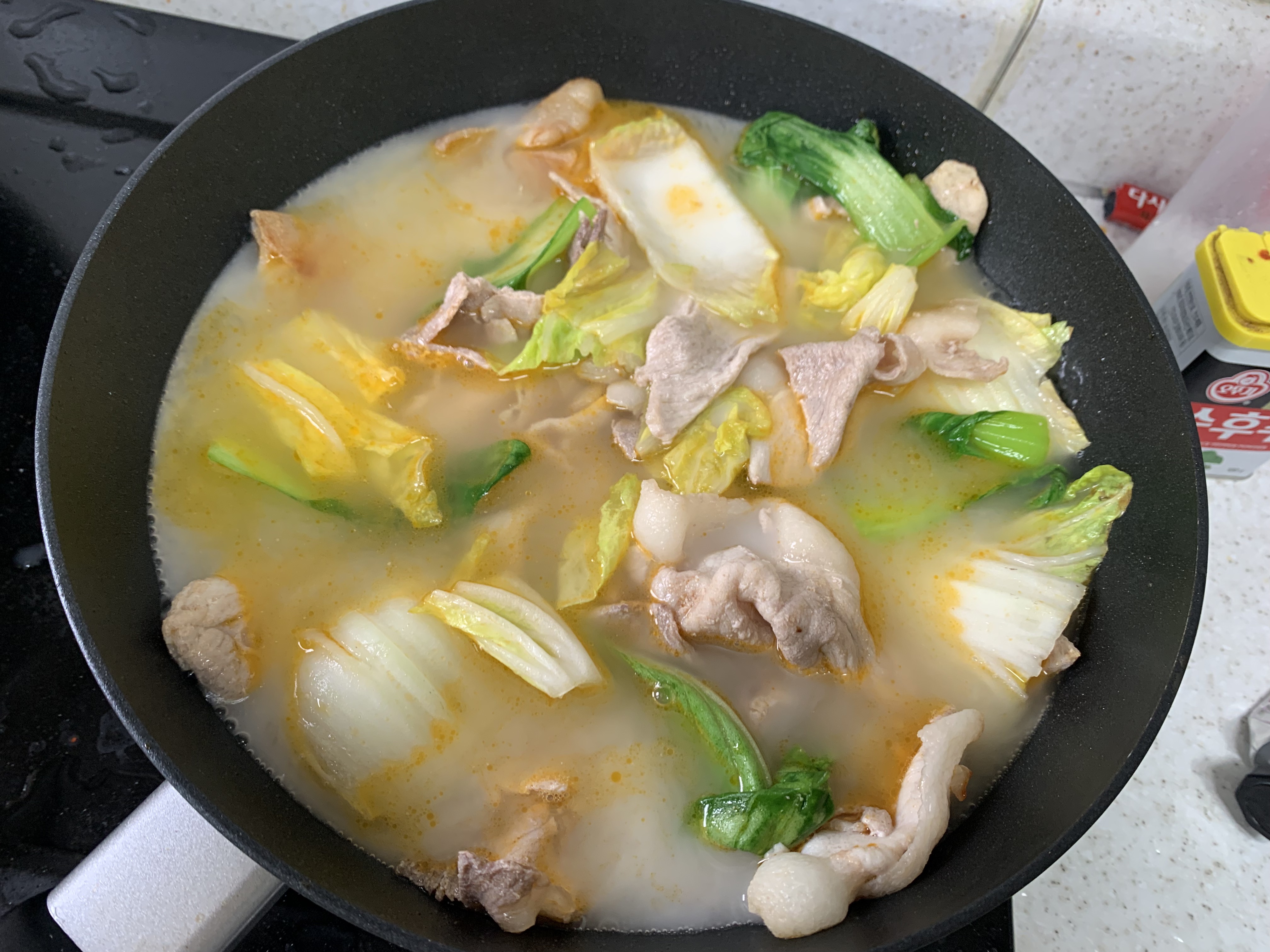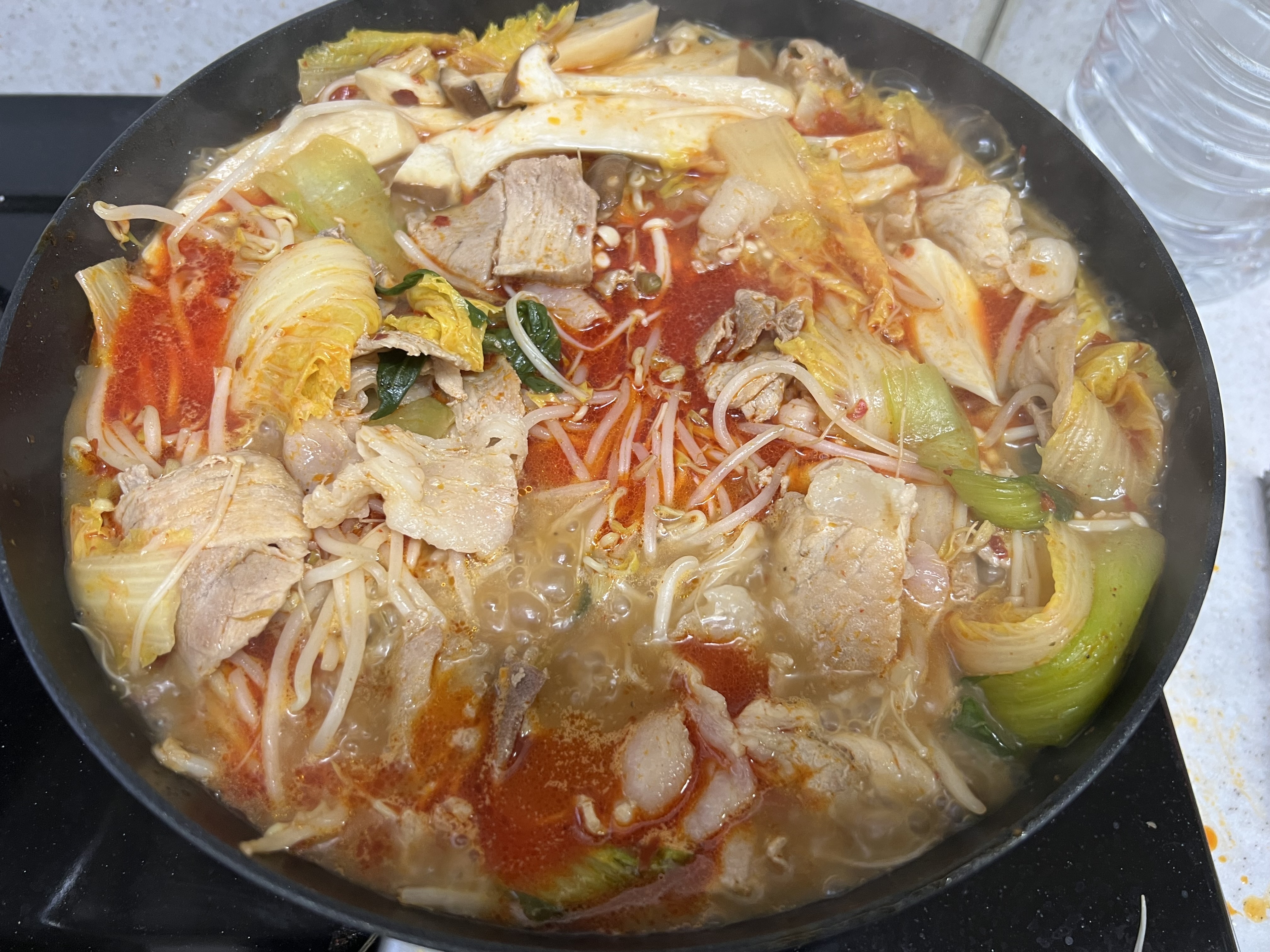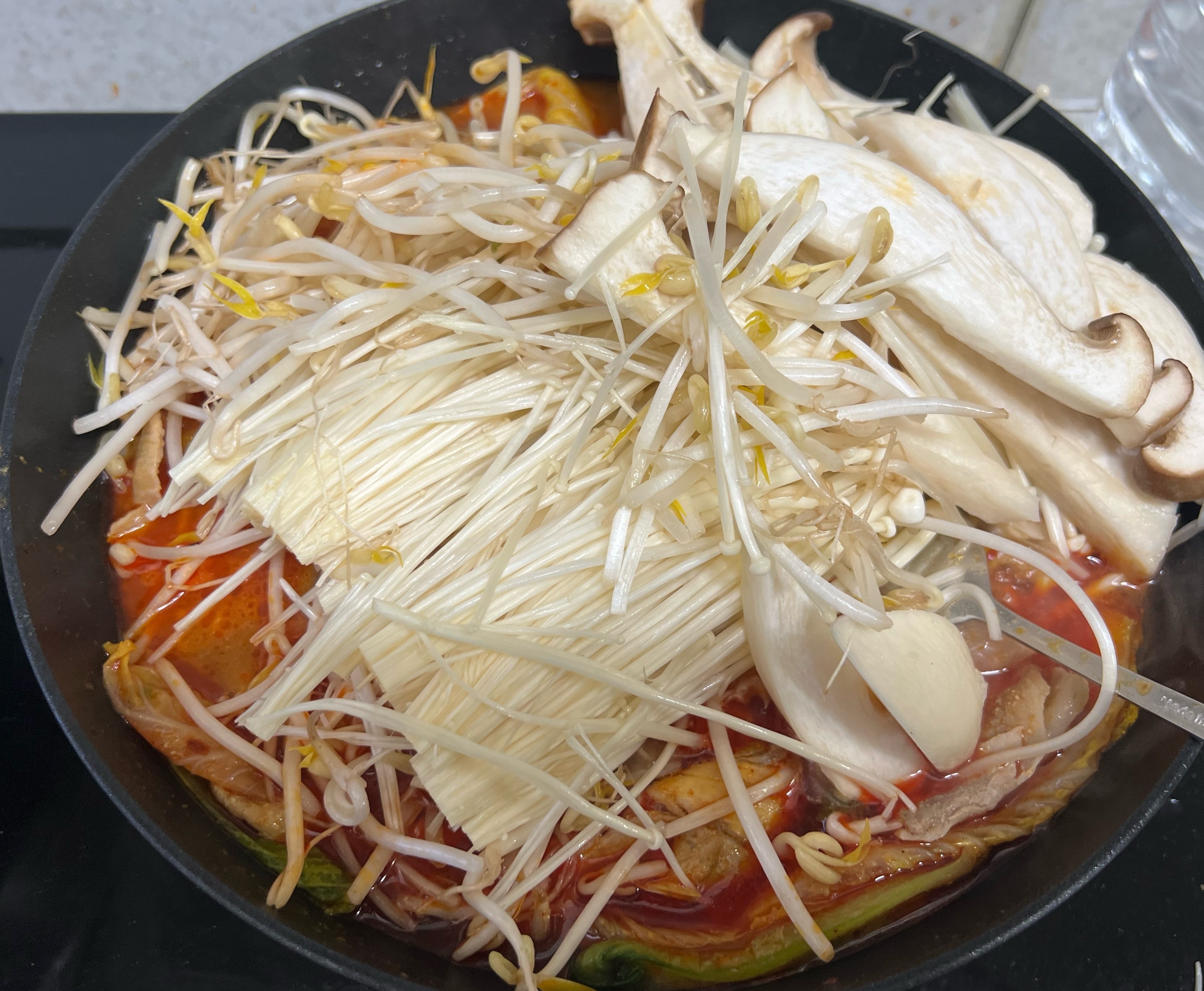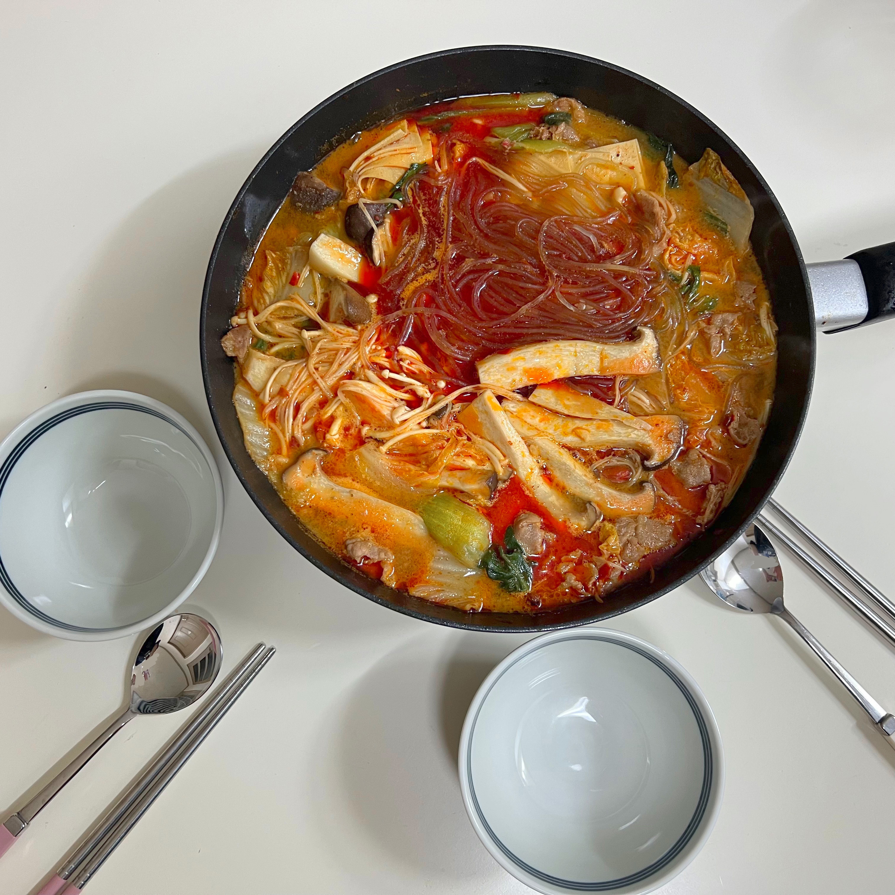 나는 새송이버섯 / 팽이버섯 / 알배추 / 청경채 / 숙주 / 고기 / 분모자 / 중국당면 / 소세지 / 건두부 정도 넣은것 같음!