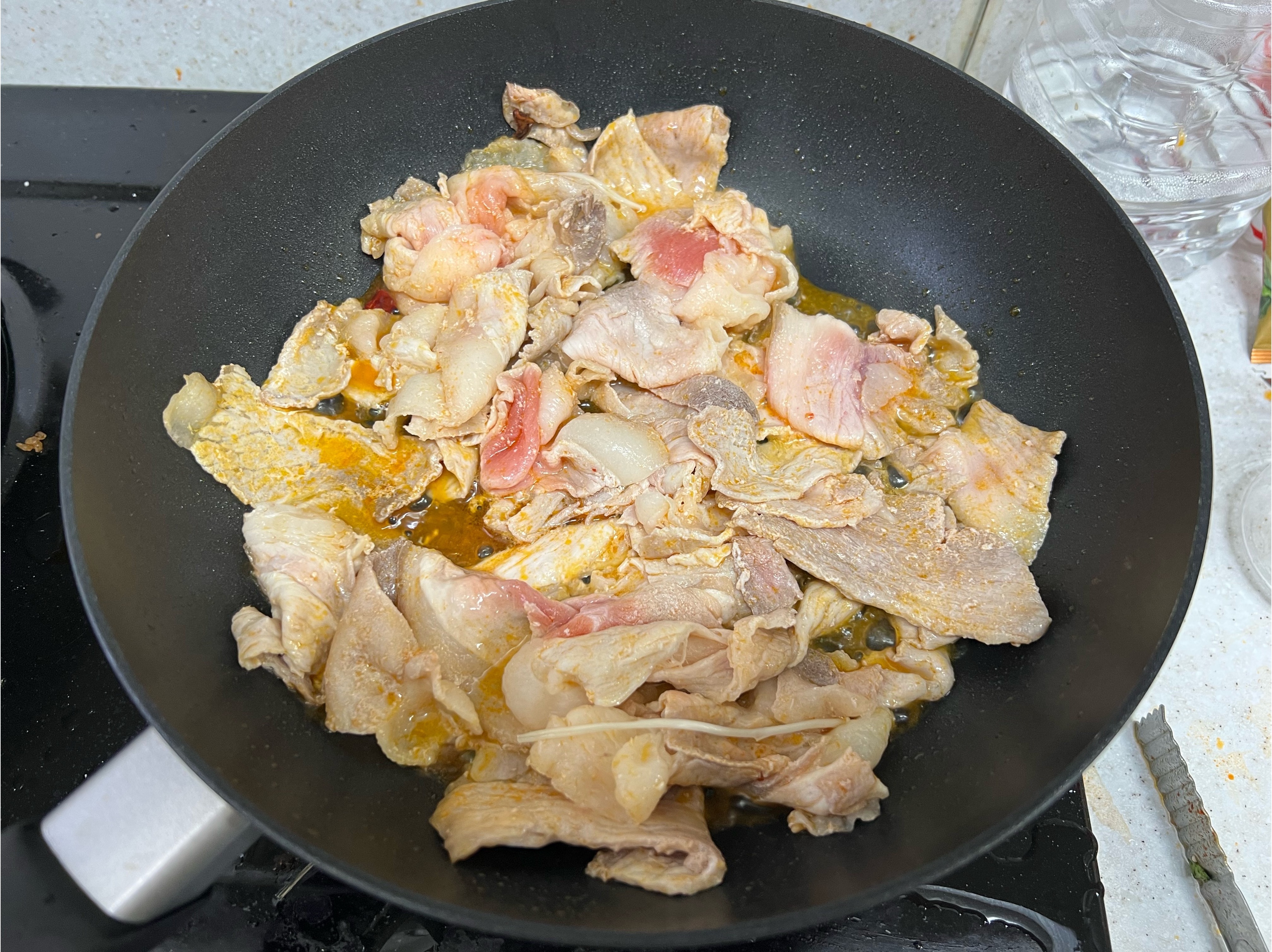 1. 고기 먹고싶은만큼과 하이디라오 소스에서 기름만 숟가락으로 1~2스푼 떠서 약불에서 볶아준다.