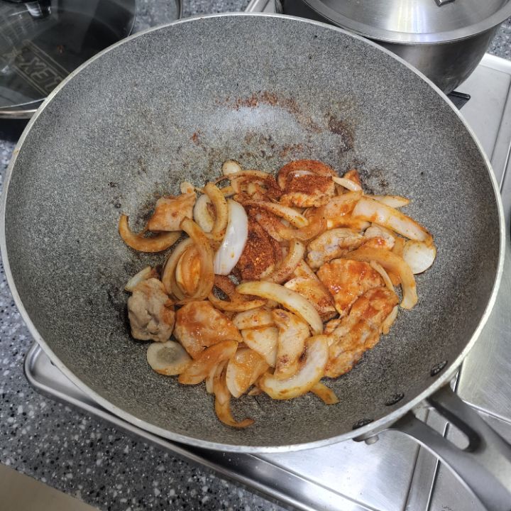어느정도 볶아지면 닭가슴살 넣고 볶