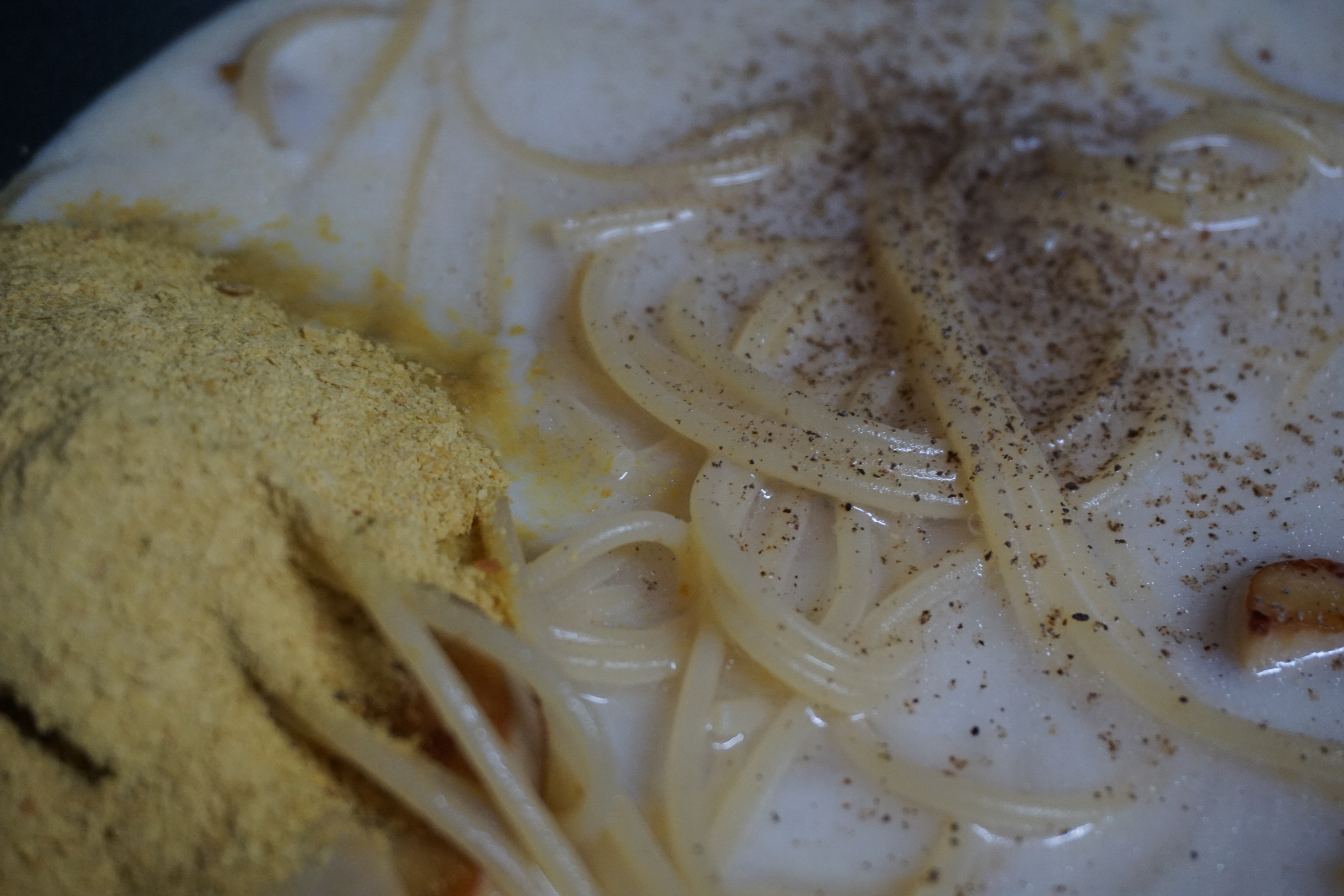 무가당 두유, 뉴트리셔널 이스트(양양 효모), 소금, 후추(통후추 강추), 올리브유(엑스트라 버진 추천), 파스타 면과 면수(또는 맹물)