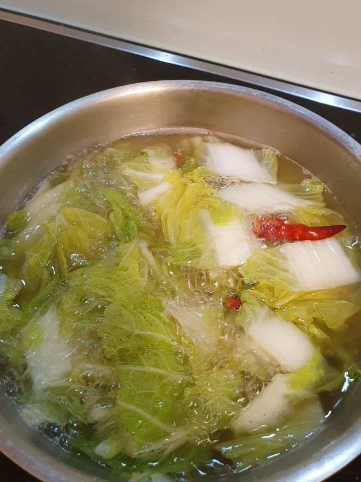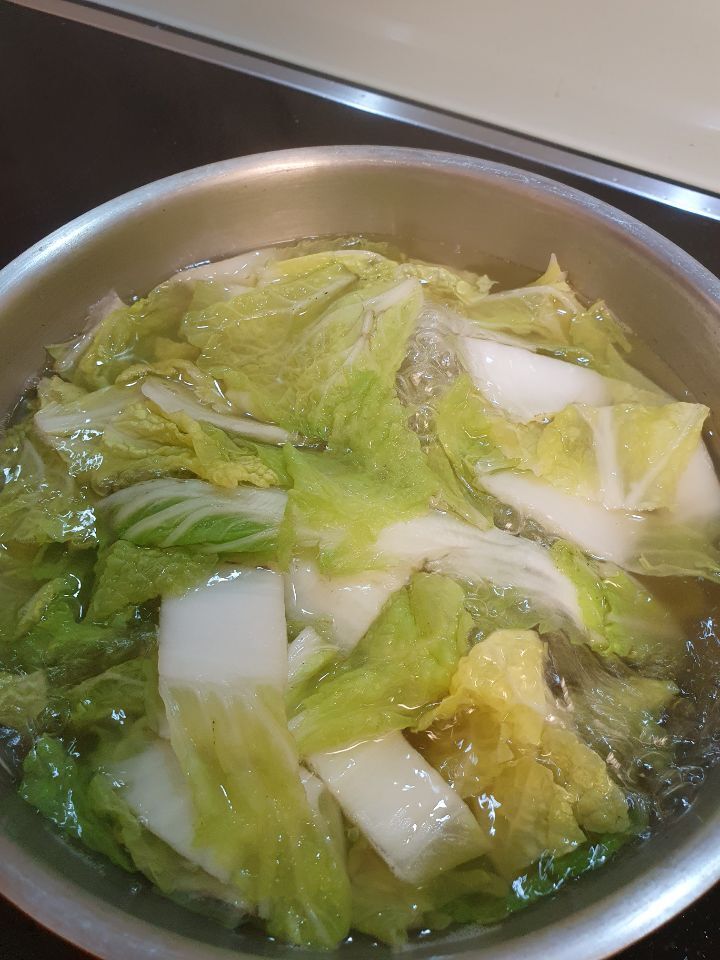 2. 불켜시고 배추한주먹 집어넣으세요 ( 길이나 모양은 취향대로 해주세요 저는 저번에는 좀 길게 이번엔 미리 썰어둔거라 그냥 토막)