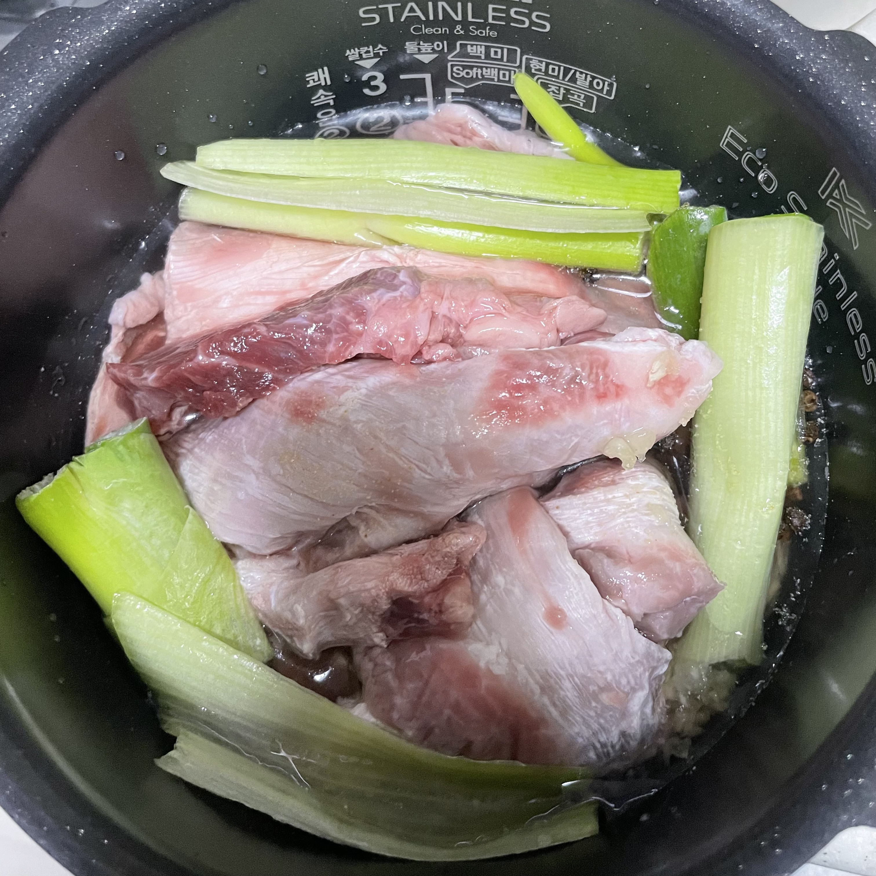 대파, 다진마늘, 통후추, 다진마늘이랑 밥솥에넣고 40분동안 만능찜으로 삶는다.