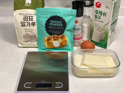 베이킹파우더 5g, 설탕 40g, 소금 3g, 우유 100ml,
