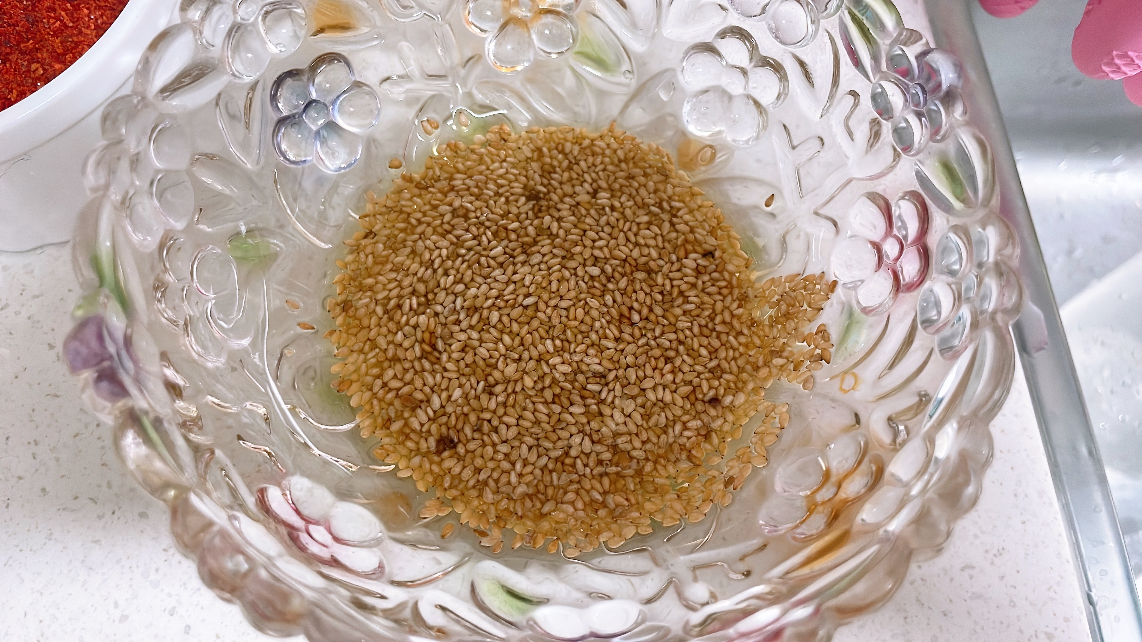 기름 큰 숫가락 3스푼 / 통깨 1스푼을 넣고 전자렌지에 3분 돌려줘!