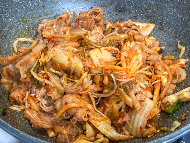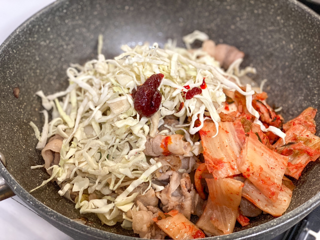 중불에서 김치랑 양배추, 불닭소스,