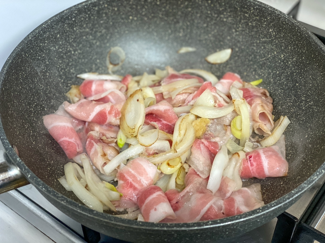 대패삼겹살 왕 큰 한 주먹, 대파 1/3, 양파 1/2개, 청양고추 1개,
