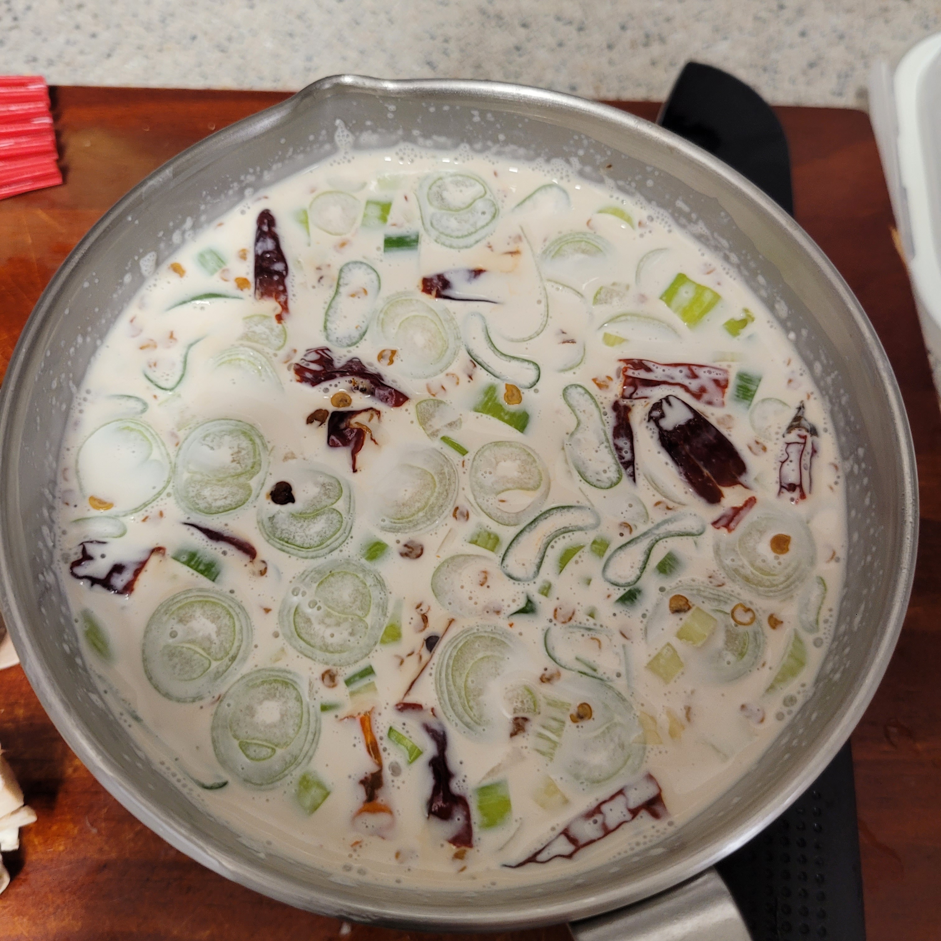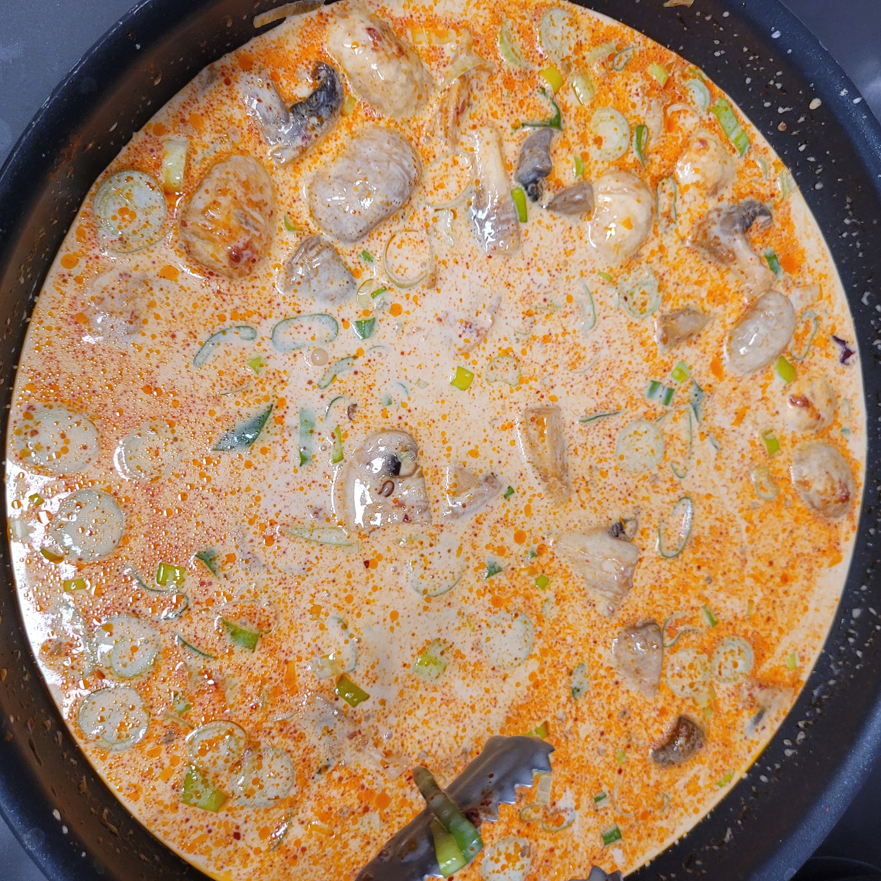 5. 생크림에 1~4. 를 다 넣고 매운맛 불고추(베트남고추)를 반씩 뽀개서 넣어줘.