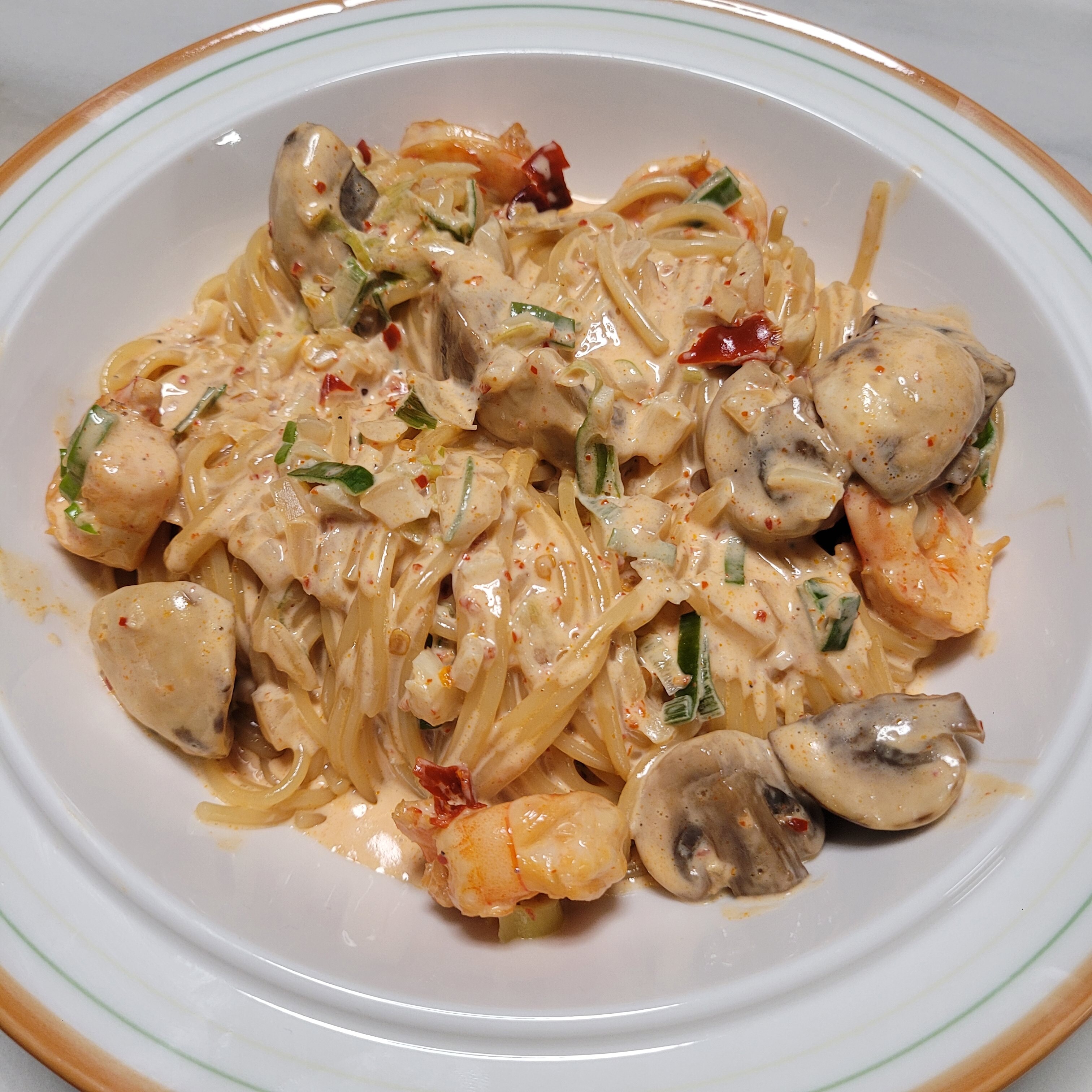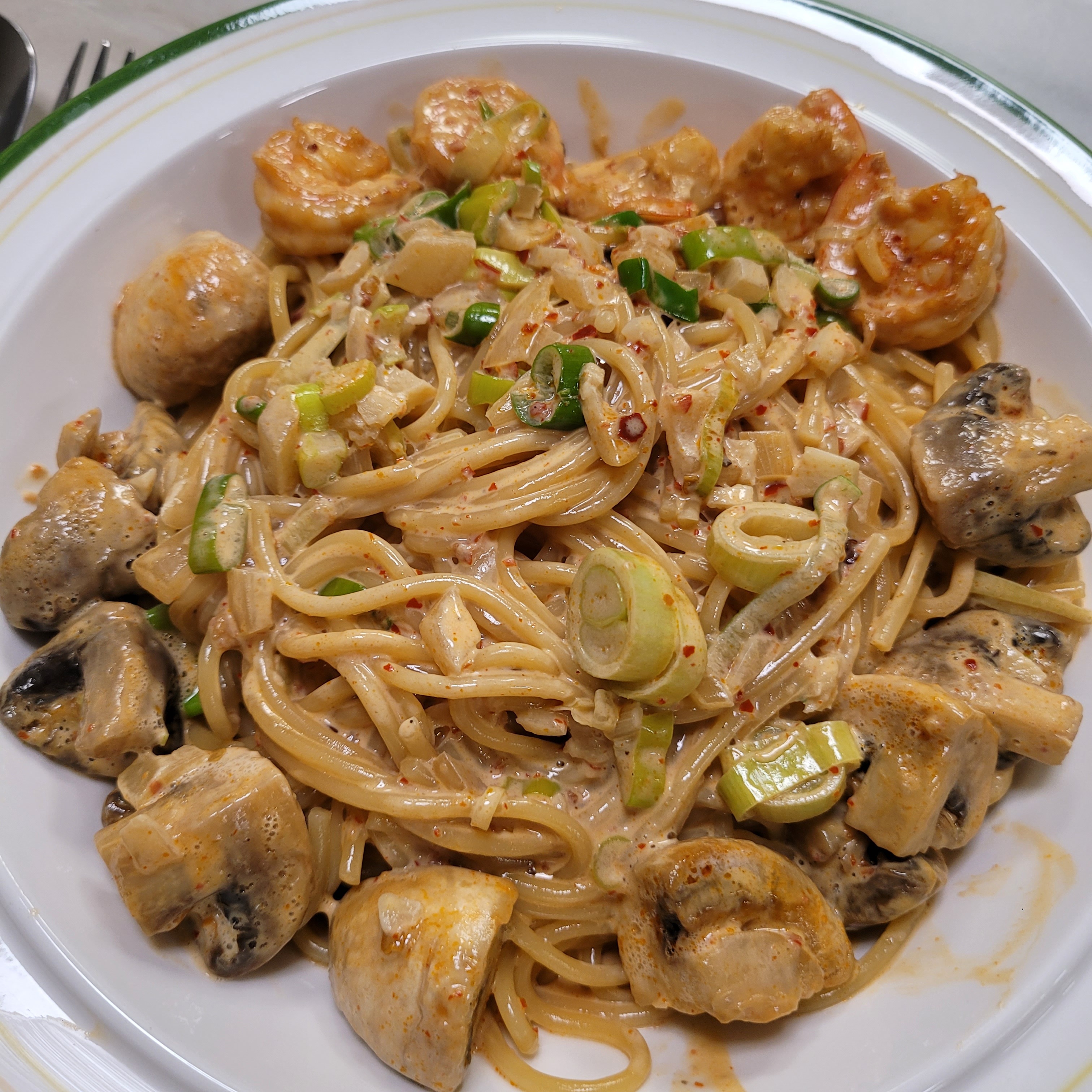 필수 - 마늘, 파 초록색 부분, 치킨스톡(다시다 대체 가능), 파스타면, 간장, 고춧가루, 케첩, 생크림(우유 대체 가능은 함), 매운맛 불고추(페퍼론치노 가능)