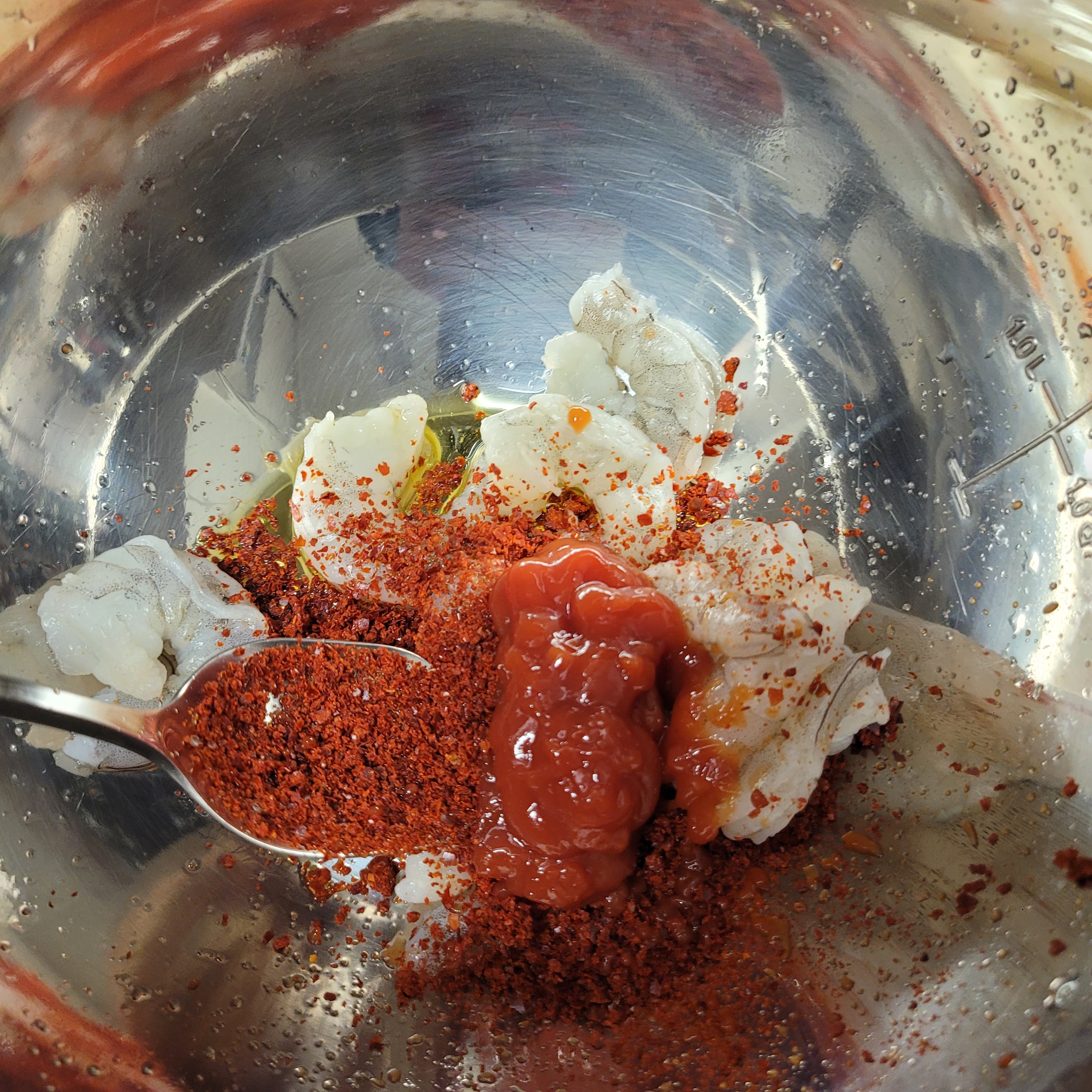 2.5인분으로 10마리 썼고 다 녹으면 올리브유 1티스푼, 고춧가루 1.5 테이블 스푼, 케첩 1 테이블 스푼 넣고 섞어줘.
