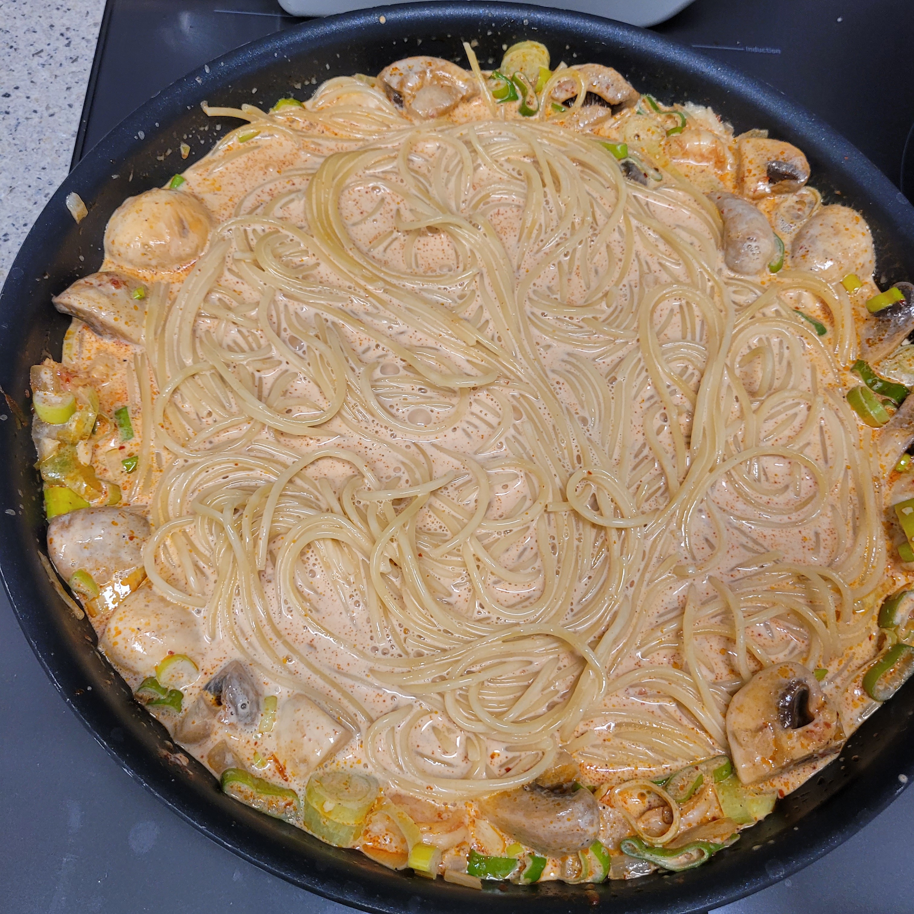 10. 소스의 가장자리가 끓기 시작하면 익혀놓은 파스타 면을 넣고 뭉근해질 때 까지 졸여줘.