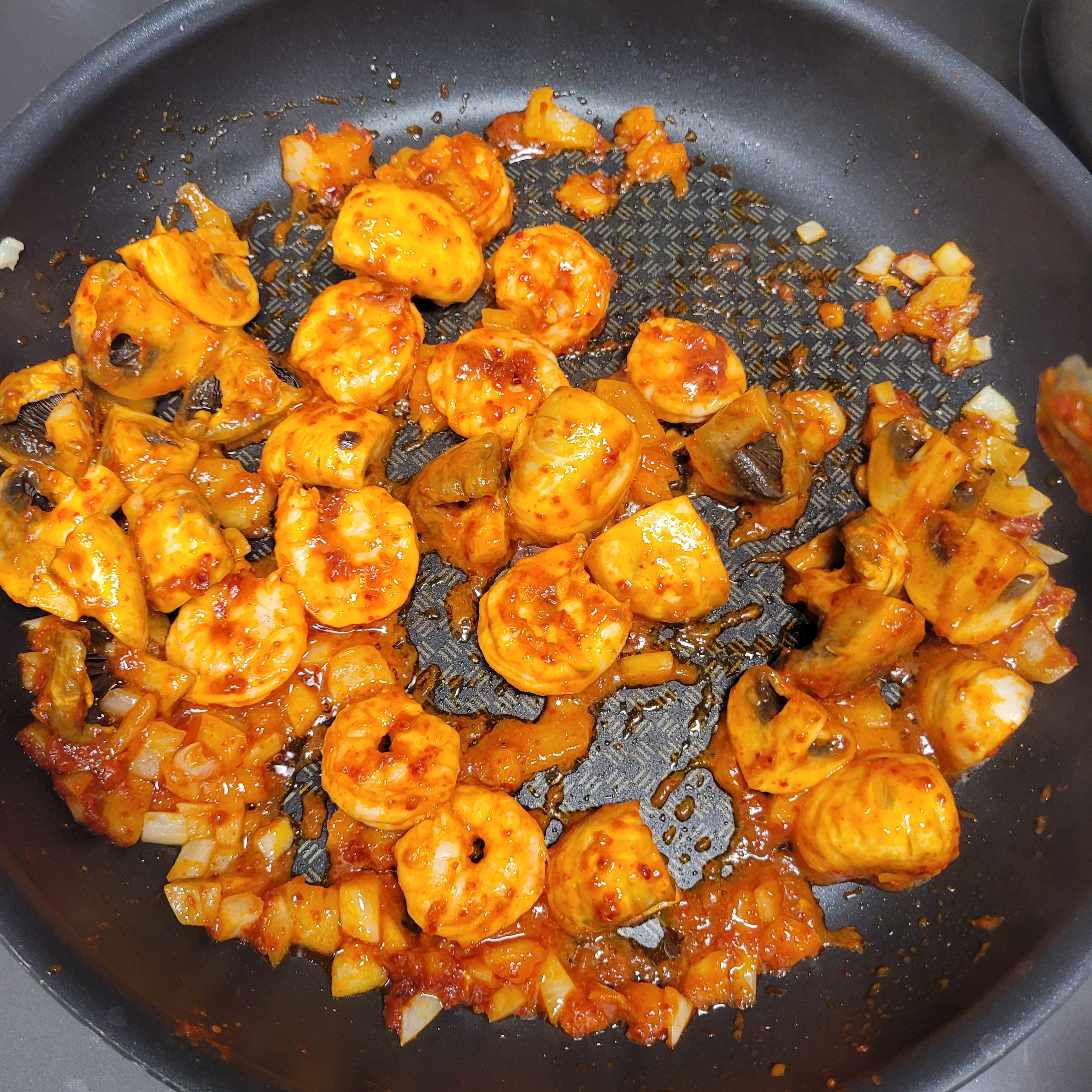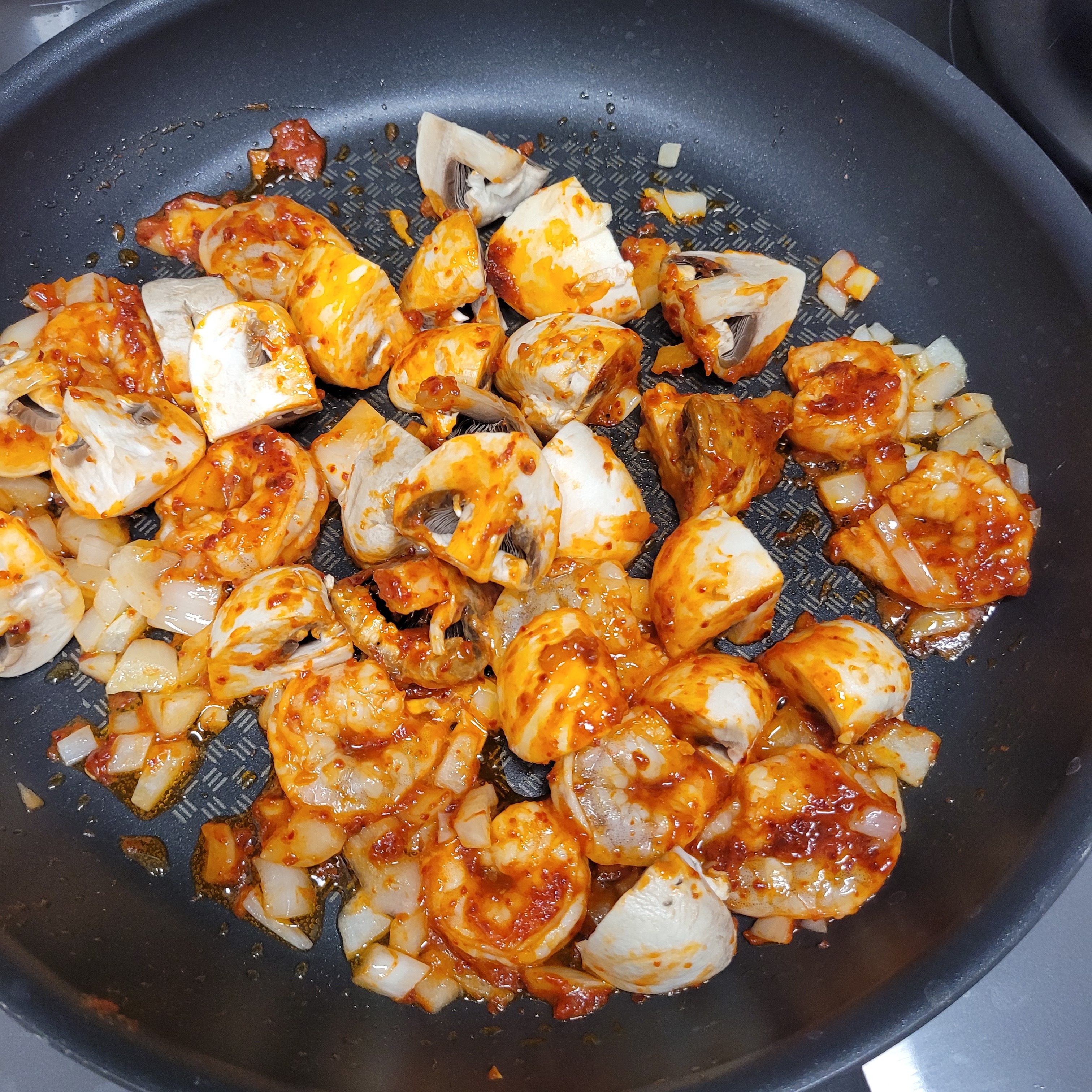 요렇게 양송이 버섯까지 빨간색 소스가 입혀지면 준비 끝.
