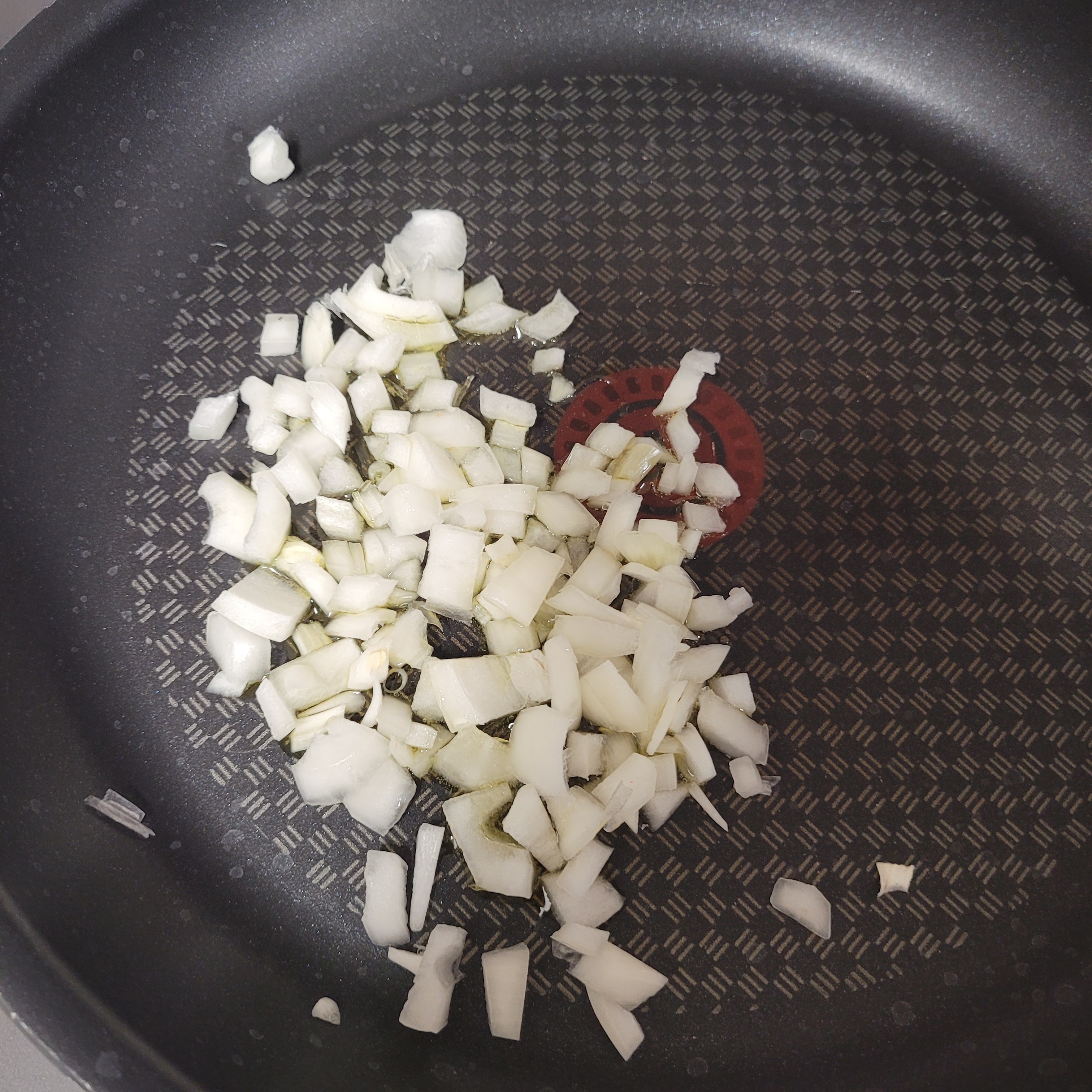 7. 이제 후라이팬 약불에 다진 양파를 익혀줘. 나는 양파 반개 썼는데 이거보다 더 많이 쓰면 소스가 좀 물러지더라.