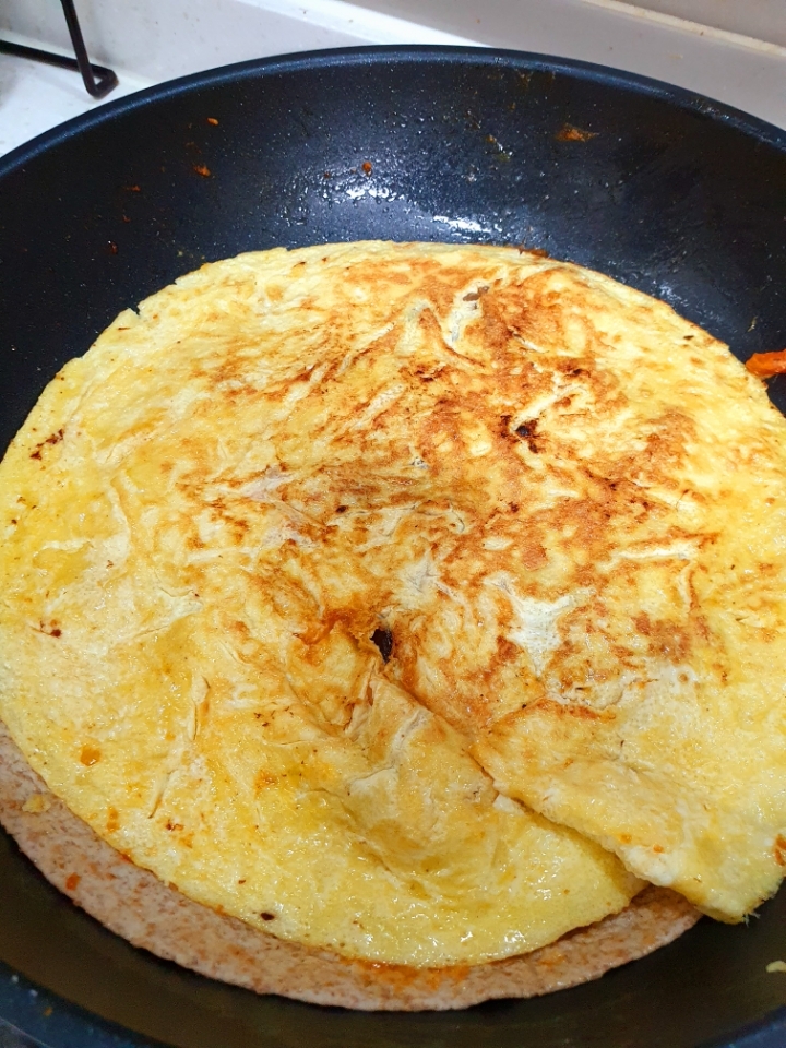 그래도 불안한 여시들은 한손으로 뒤집개를 계란부친거(뜨거움) 밑으로 넣은 다음에 한손으로는 또띠야 (안뜨거움) 위에 눌러서 뒤집어주세요