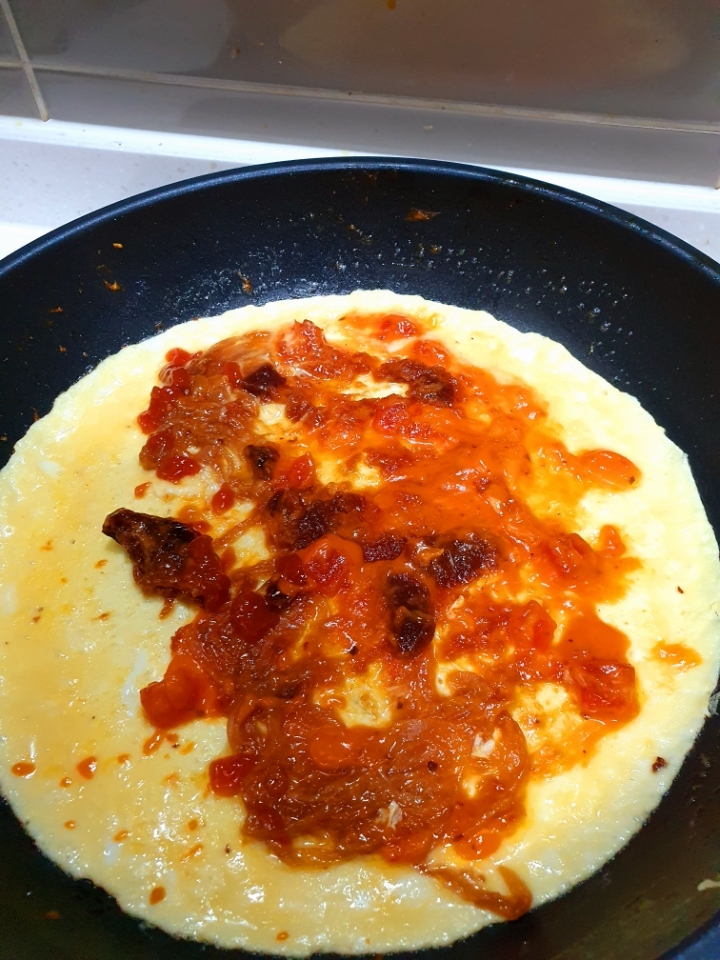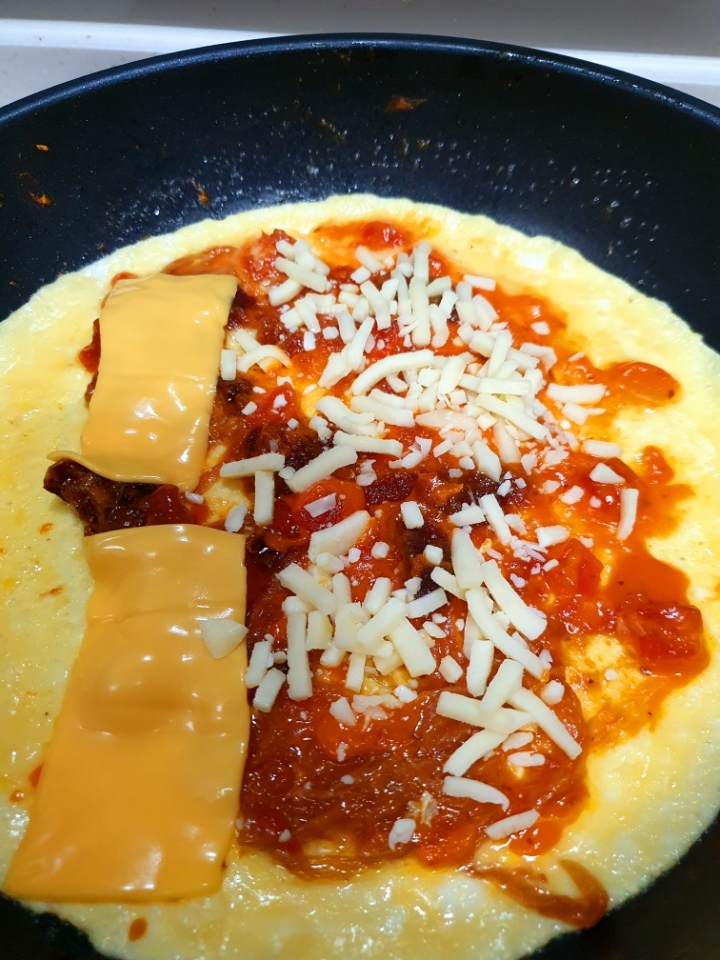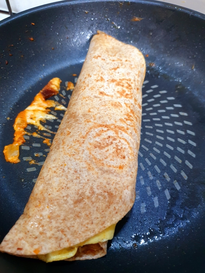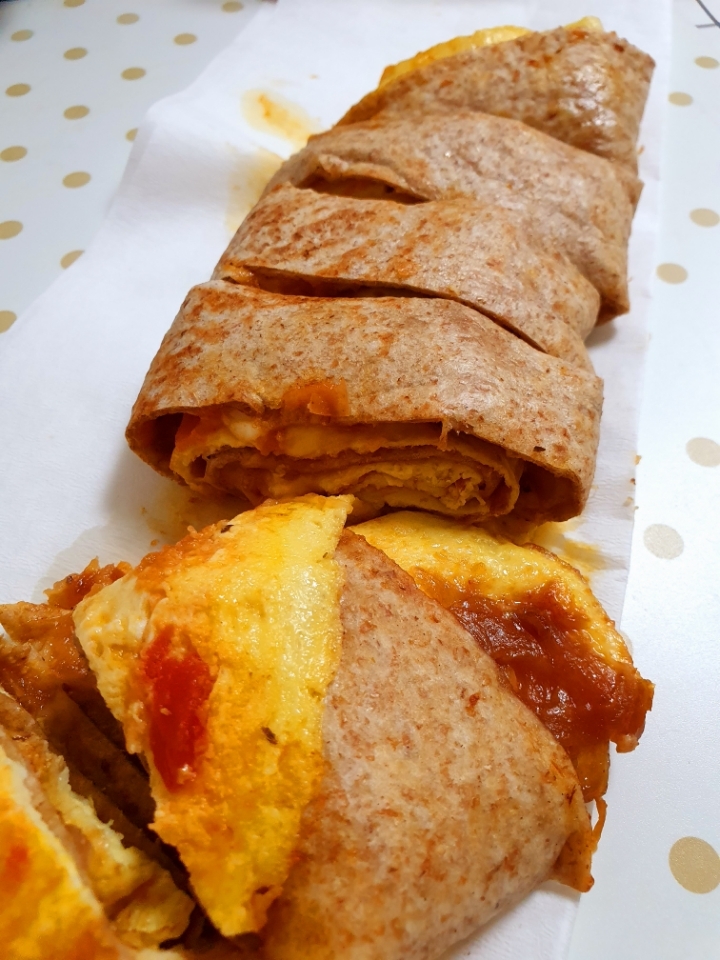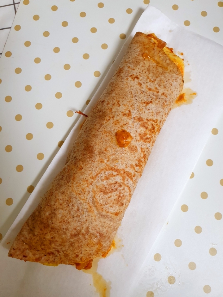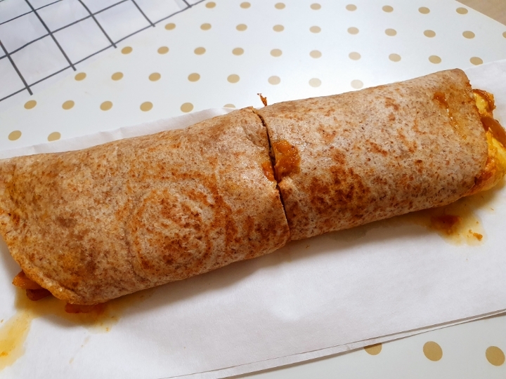 또띠아 큰거 한장 , 달걀 2개 , 치즈 , 소스