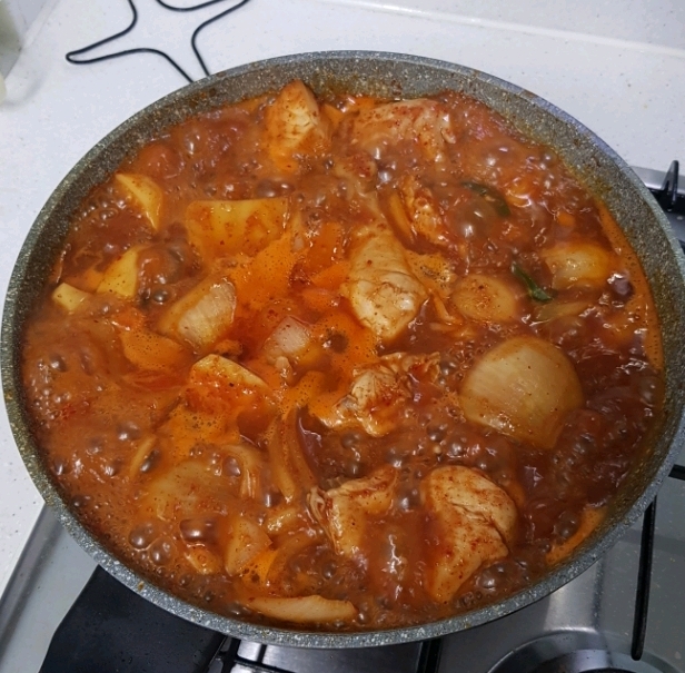 사실 당면이 있어야 하는데 까먹음... 그리고 사진보다 덜 벌건데 너무 빨갛게 나왔어 참고해!