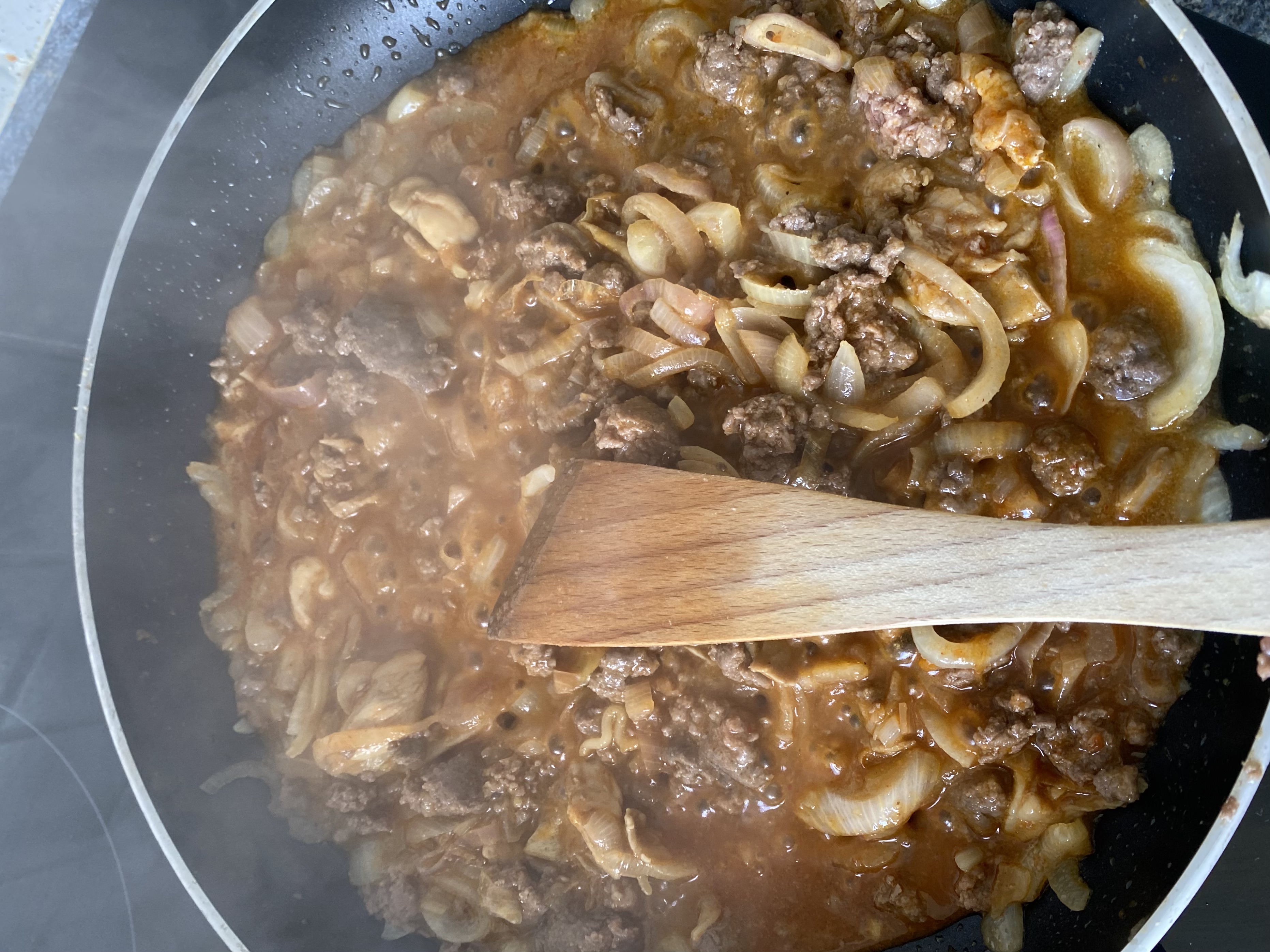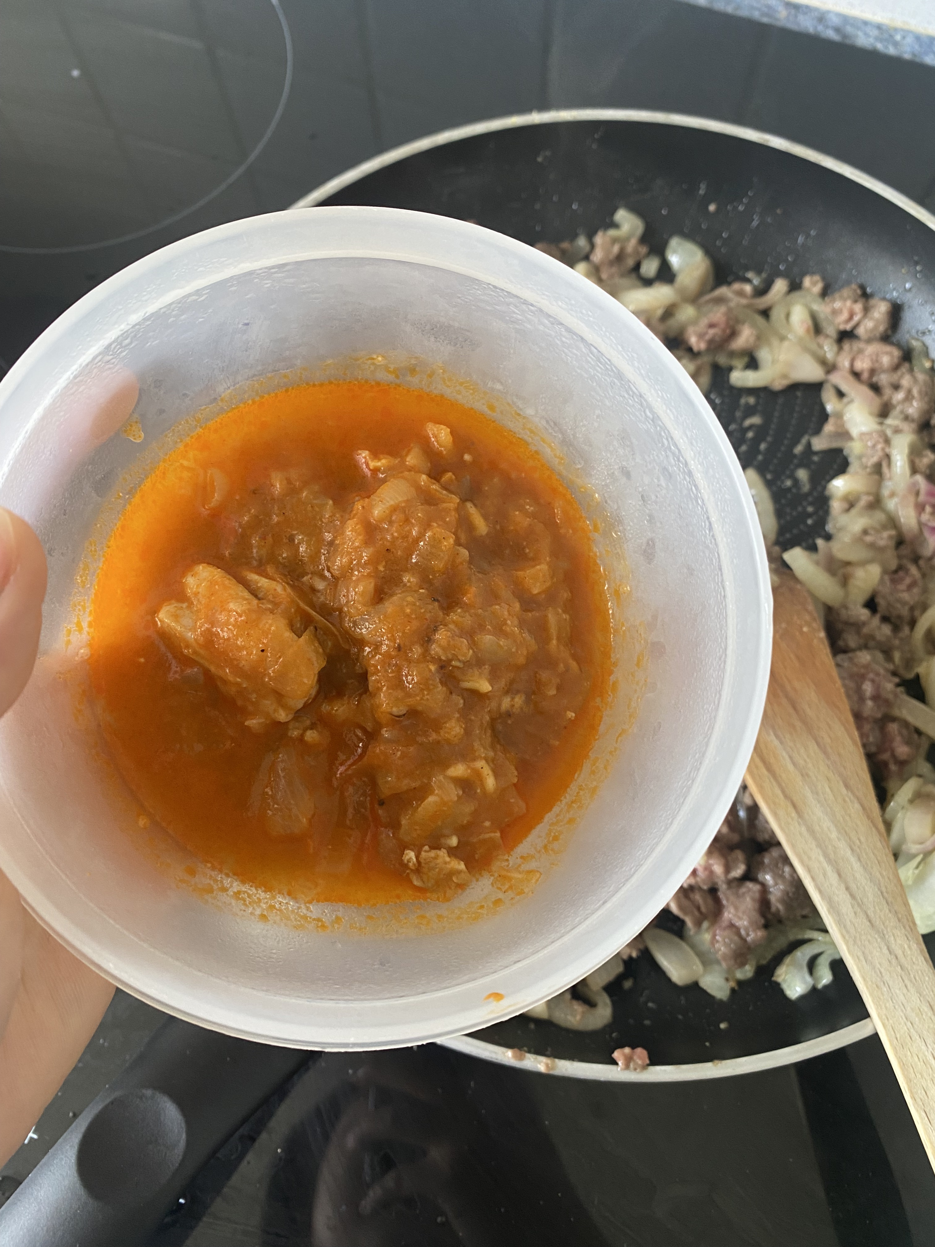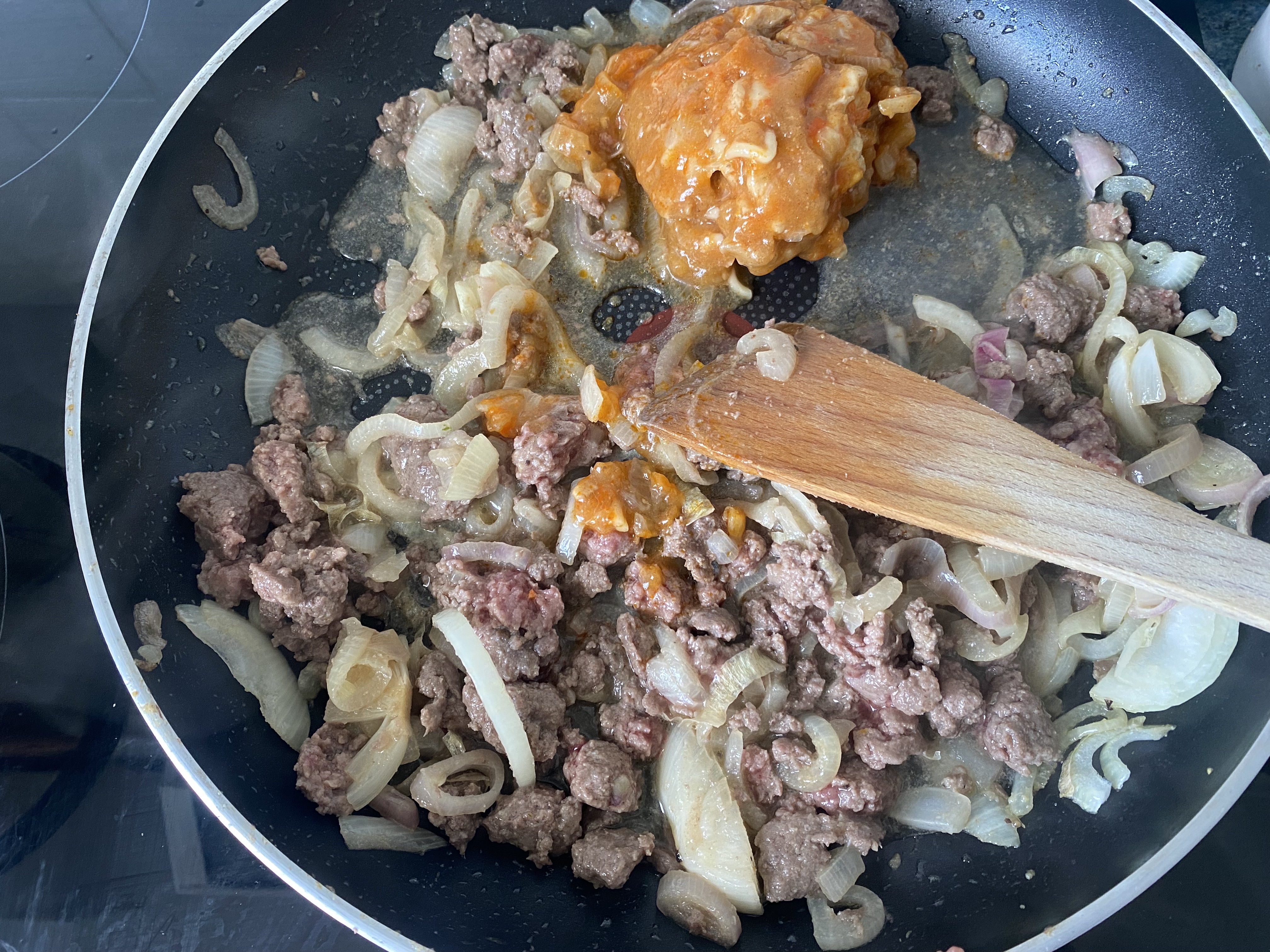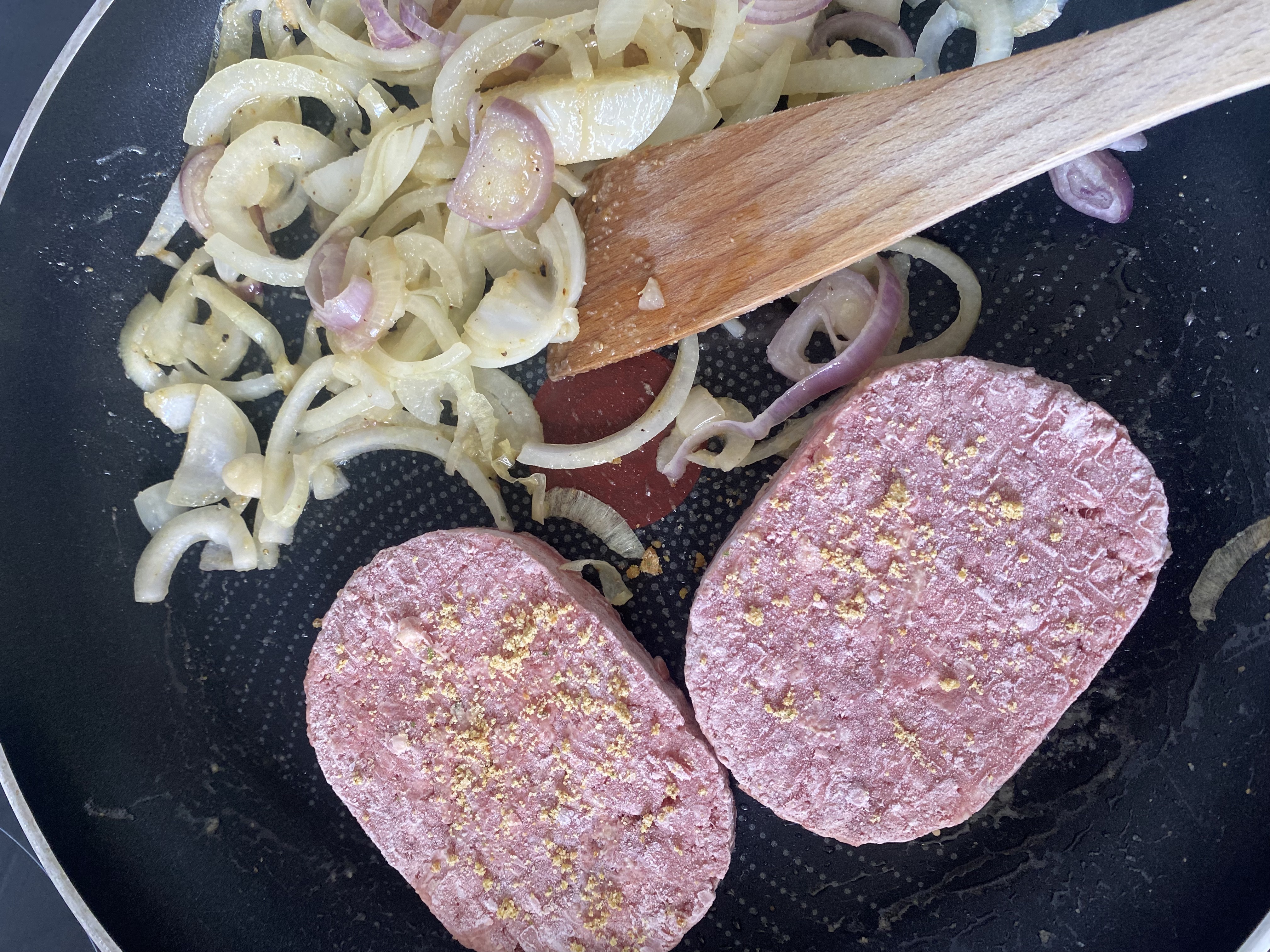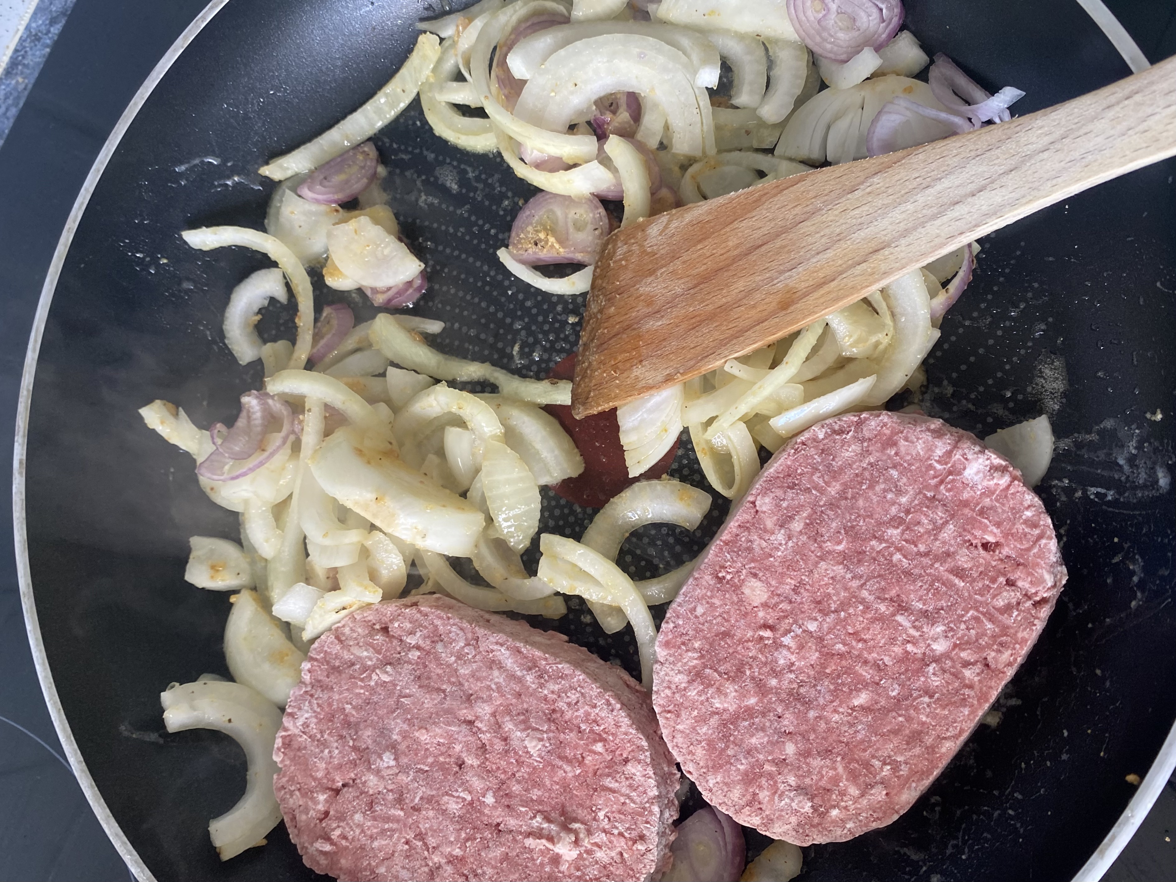 양파가 투명해지면 냉동실에 굴러다니는 고기를 넣어줘요